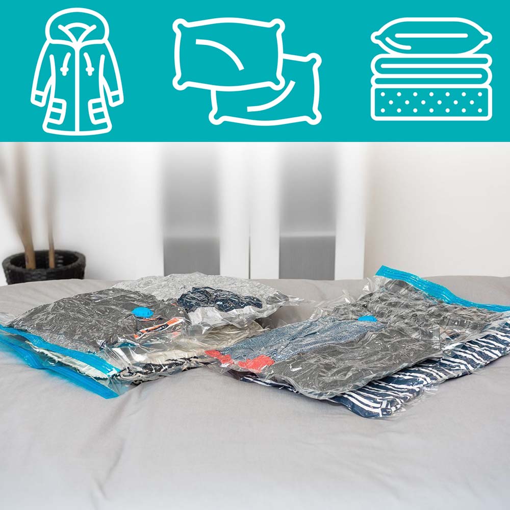 Helyezd a használaton kívüli ruháid a vákuumos tárolózsákba, és tartsd őket gyűrődésmentesen akár a következő szezonig. A szabadalmaztatott szelepeknek köszönhetően egyszerűen, egy porszívó segítségével kiszippanthatatod a felesleges levegőt a zsákból, ezáltal a ruhák helyfoglalását nagymértékben csökkentheted. A vákuumzsákot szinte bárhol tárolhatod, hiszen rendkívül tartósak és védelmet biztosítanak a víz, a por, a szagok és a rovarok ellen is. Szinte bármilyen ruha elhelyezhető a tárolózsákokban, legyen szó akár kosztümökről, téli kabátokról, öltönyökről, ágyneműkről vagy a paplanokról és a párnákról.