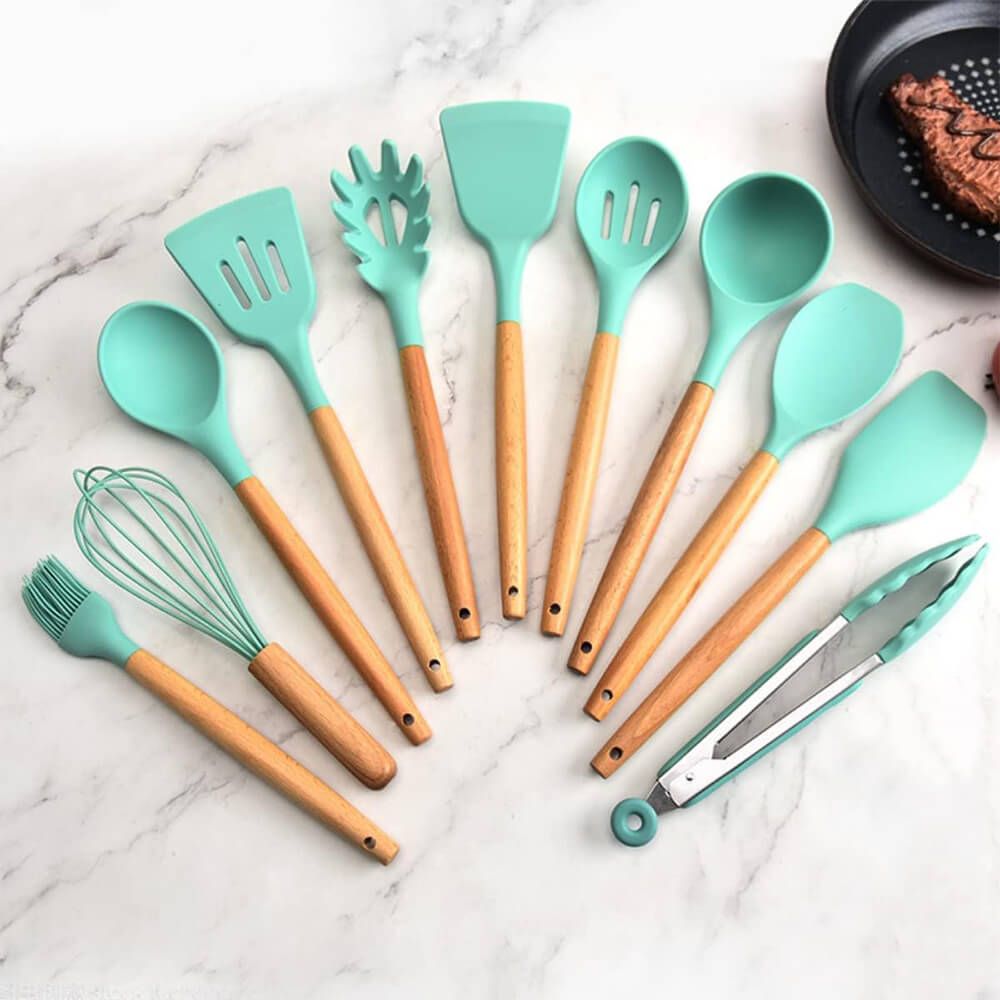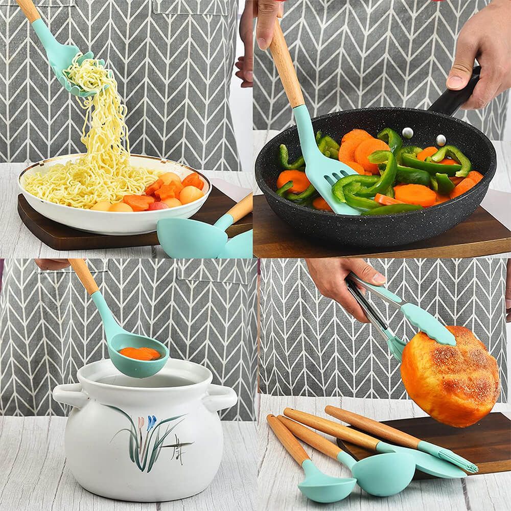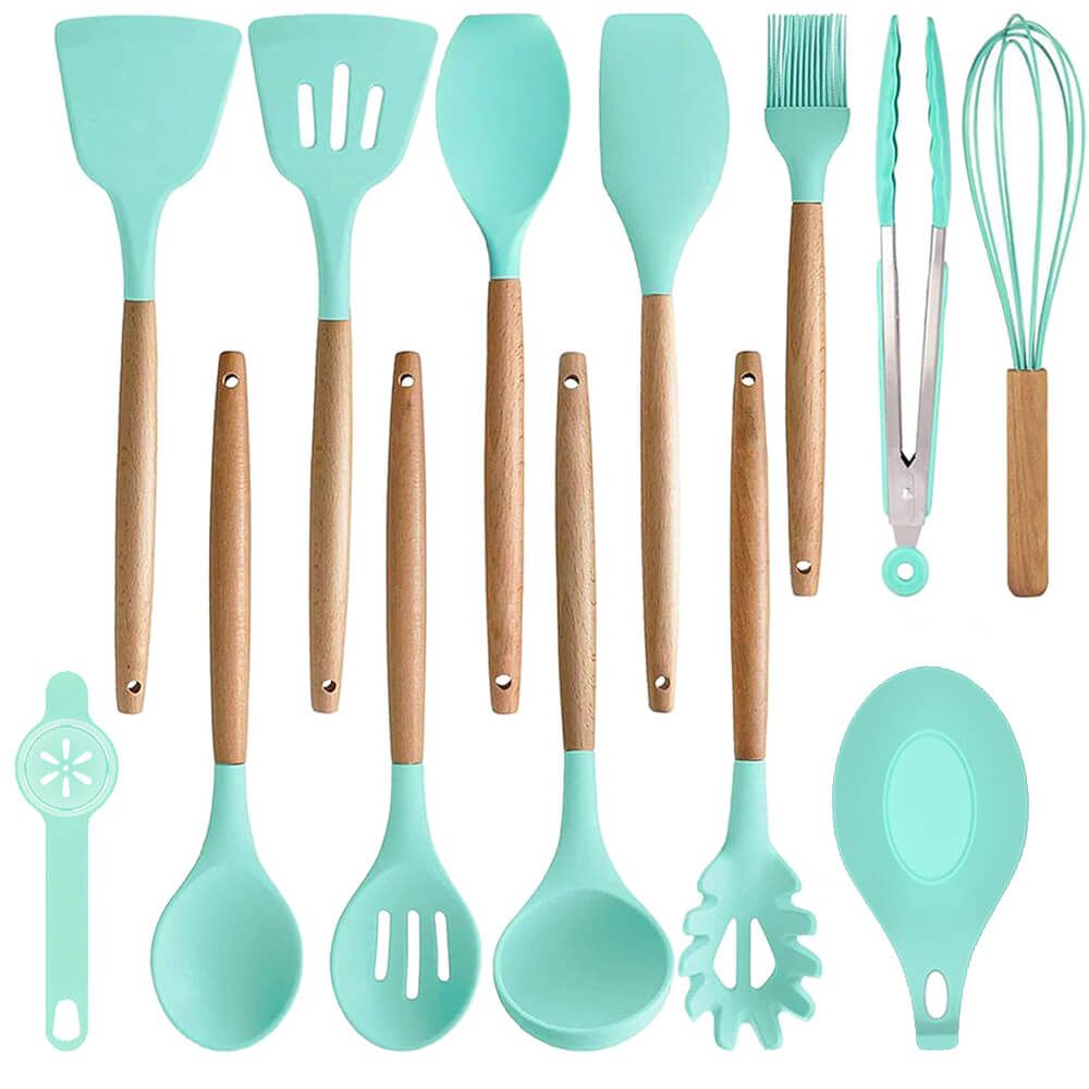 14-darabos konyhai eszközkészlet hőálló szilikon fejjel tartóval türkiz HOP1001658-3