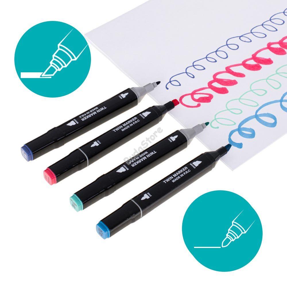 Minden marker kétféle hegyszélességgel van ellátva a pontos színezéshez és a műved kidolgozásához. A vastagabb oldala ami maximum 5 mm-es vonalvastagságot tesz lehetővé tökéletes választás árnyékoláshoz, színezéshez és kitöltéshez. A vékonyabb oldala ami maximum 1  mm, kontúrozáshoz vagy aprólékosabb képek készítéséhez. A készlethez tartozik egy praktikus hordtáska, amellyel bárhová magaddal viheted. A tinta festéskor nem kenődik el, de gyors színkeverést tesz lehetővé, száradás után pedig maradandóvá válik.