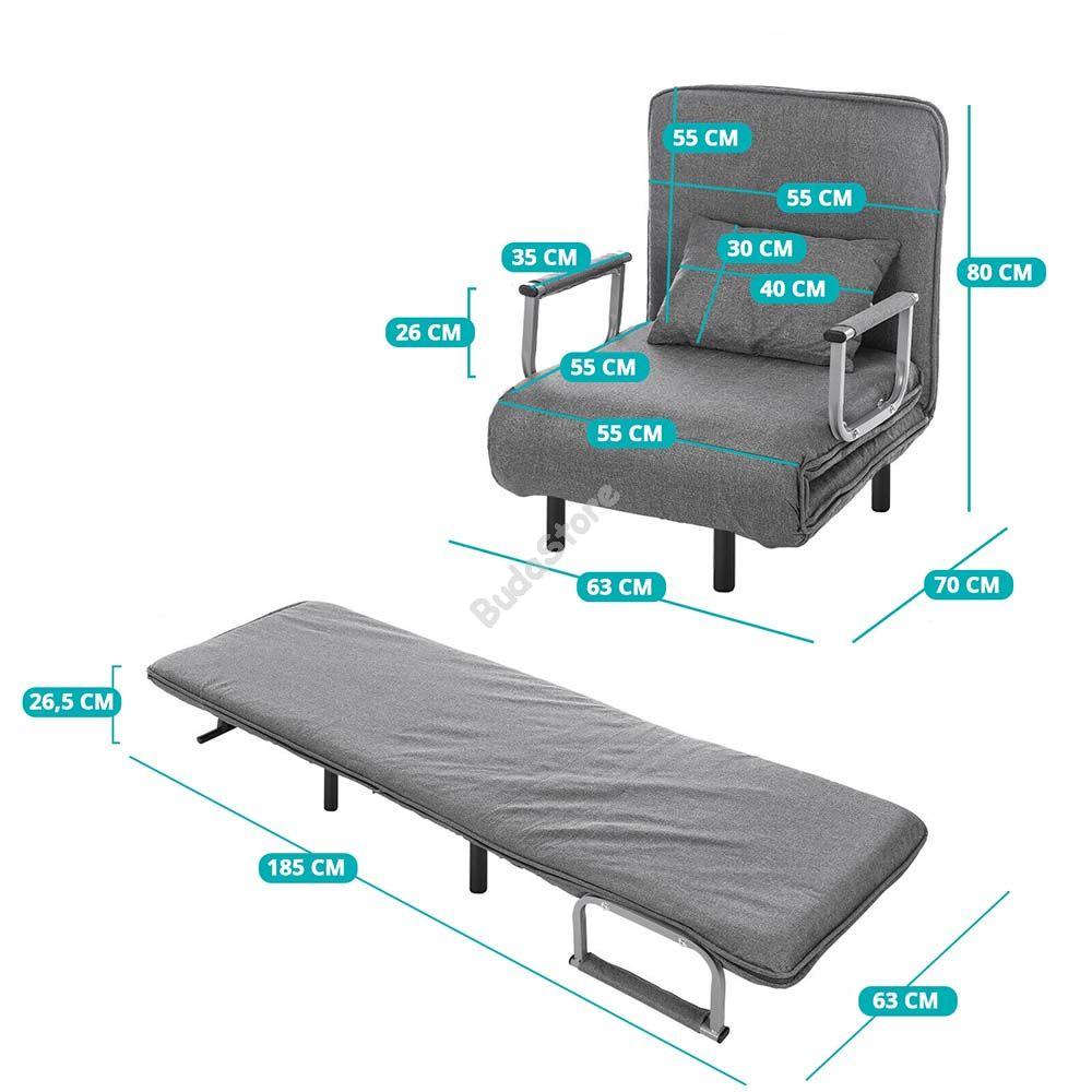 Rendkívül kényelmes és helytakarékos megoldást kínál otthonodba, akár te vagy vendégeid vennék igénybe. Elegáns dizájnjával és több választható színével biztosan megtalálod a stílusodnak megfelelőt. Párnázott karfái biztosítják a kényelmes pihenést egy beszélgetés vagy tv nézés közben is. Könnyedén kinyitható, így pillanatok alatt kényelmes fekhelyet varázsolhatsz belőle. 6 cm-es párnázata biztosítja a kényelmes használatot akár fotelként, akár ágyként használod éppen. Kialakítása, praktikussága és széles színválasztéka miatt ez a fotelágy egy valódi kincs lehet otthonodban. Maximális teherbírása 120 kg.