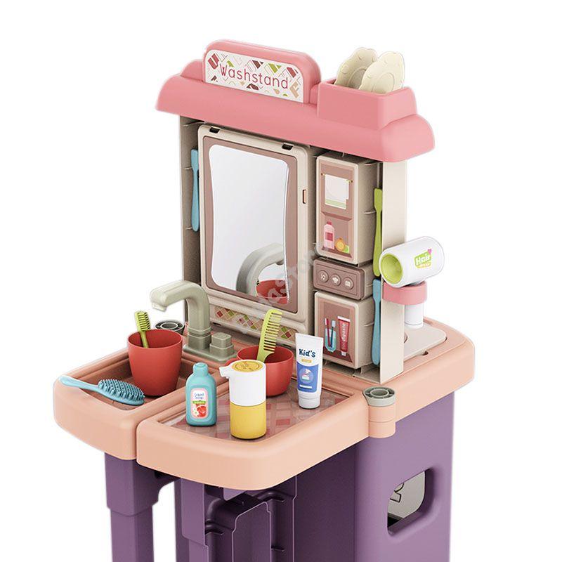 A játékkonyha másik oldalán található fürdőszoba, és annak kiegészítői segítenek kialakítani a gyermekeknek a napi rutint, legyen szó akár a fogmosásról, fésülködésről vagy egyéb higiénés tevékenységekről. Mindezt játékos módszerrel a kicsik saját tempójukban sajátíthatják el, így megkönnyítve nekik akár a szociális beilleszkedést.