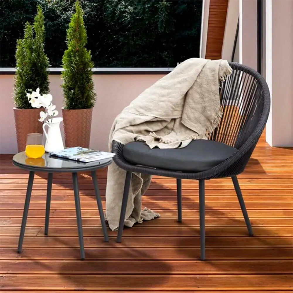 A szettünk két fonott kialakítású fotelből és egy kisasztalból áll, melyek tökéletes megoldást nyújtanak teraszra, erkélyre vagy más kültéri helyekre.