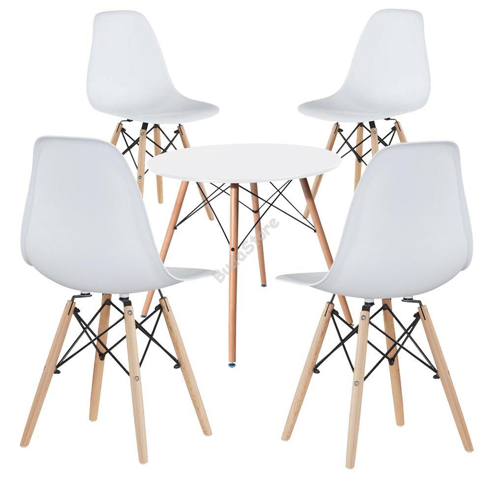 Ez a modern étkezőgarnitúra otthon vagy egy vendéglátó egységben is megállja a helyét. A bútorok tervezése során a műanyag, a fém és a fa is jelentős szerepet kapott, ezek ötvözete igazán különleges megjelenést biztosít. Az étkezőszékekhez egy 60,5 cm átmérőjű asztal is tartozik. A szett fehér, fekete és szürke színben kapható, így mindenki megtalálja a számára megfelelőt.