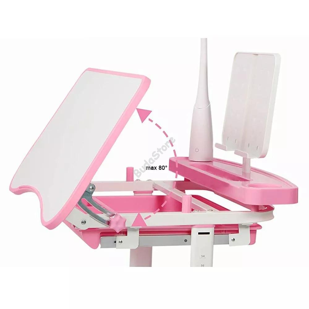 Az állítható magasságú gyerek íróasztal székkel minden bizonnyal a legpraktikusabb bútordarab lesz a gyerekszobában. Az asztal teljes magassága, és az asztallap dőlésszöge egyaránt állítható, ahogyan a szék magassága is. Tökéletes bútor szett a gyerekek számára tanuláshoz, játékhoz, rajzoláshoz vagy olvasáshoz. Az asztal sarkában található lámpa magassága és iránya állítható, színét 2 tónusból választhatod ki. Az asztallap alatt található kihúzható tárolóban elférnek a füzetek, író és rajzeszközök és egyéb kellékek.