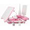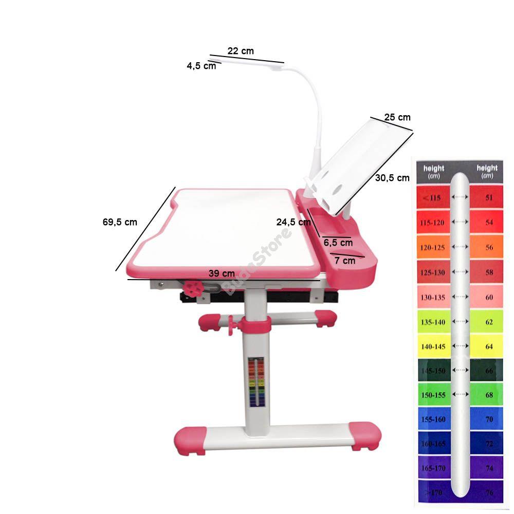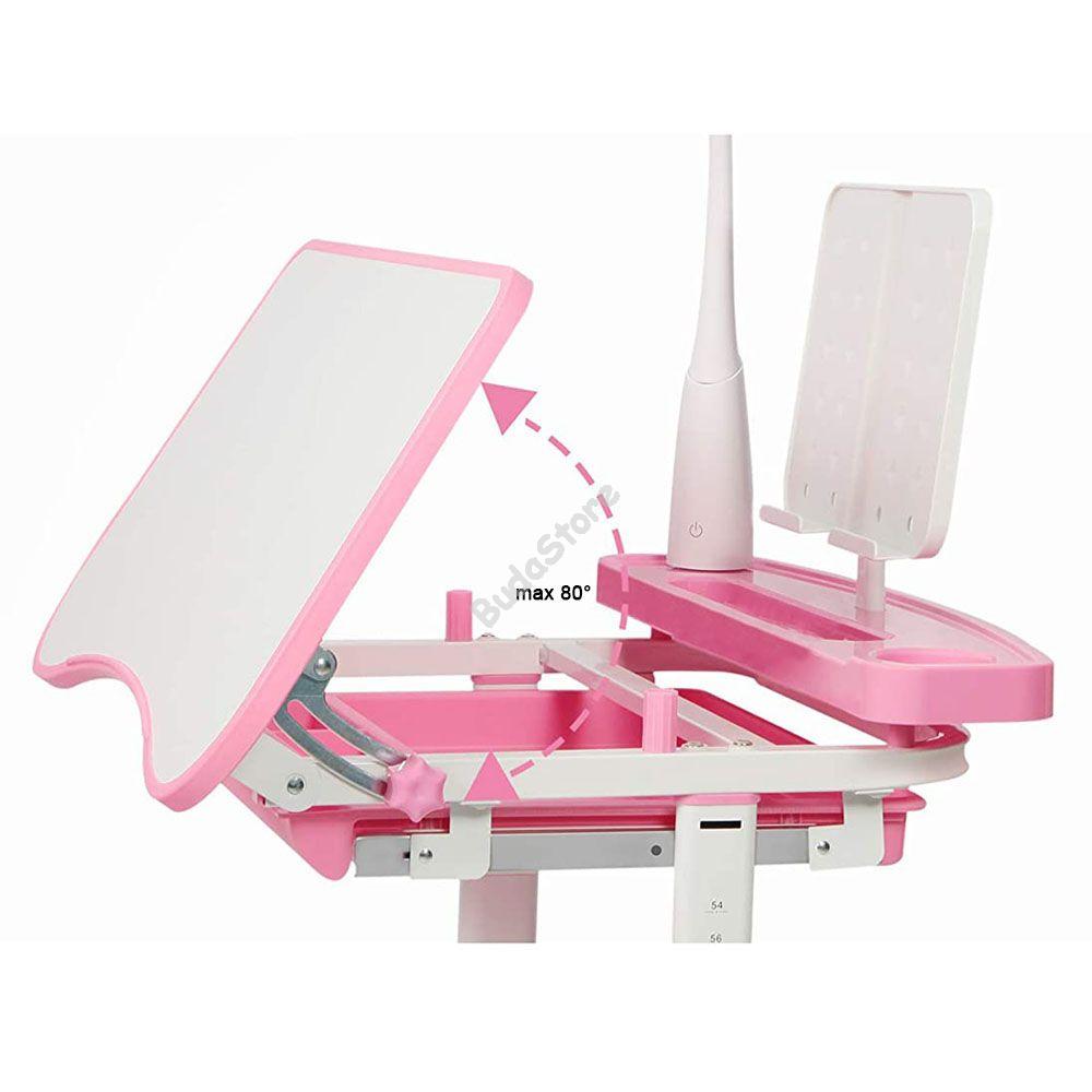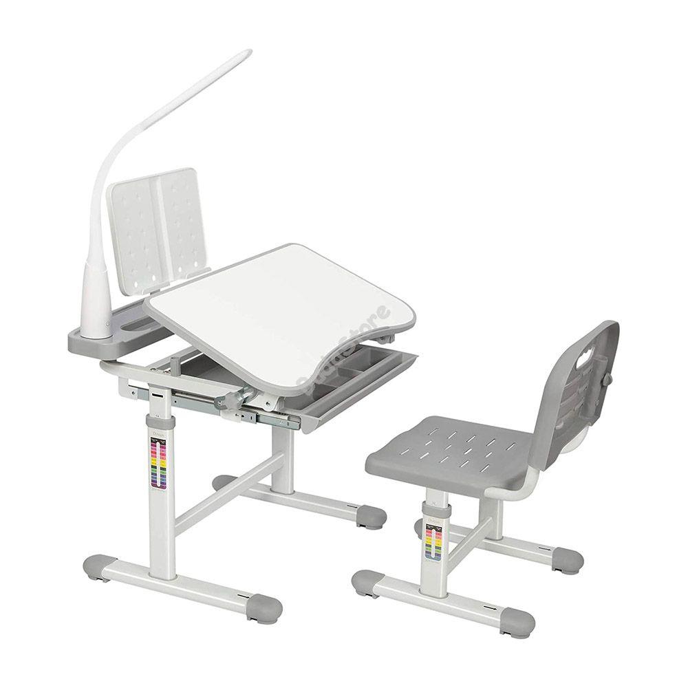 Az állítható magasságú gyerek íróasztal székkel minden bizonnyal a legpraktikusabb bútordarab lesz a gyerekszobában. Az asztal teljes magassága, és az asztallap dőlésszöge egyaránt állítható, ahogyan a szék magassága is. Tökéletes bútor szett a gyerekek számára tanuláshoz, játékhoz, rajzoláshoz vagy olvasáshoz. Az asztal sarkában található lámpa magassága és iránya állítható, színét 2 tónusból választhatod ki. Az asztallap alatt található kihúzható tárolóban elférnek a füzetek, író és rajzeszközök és egyéb kellékek.