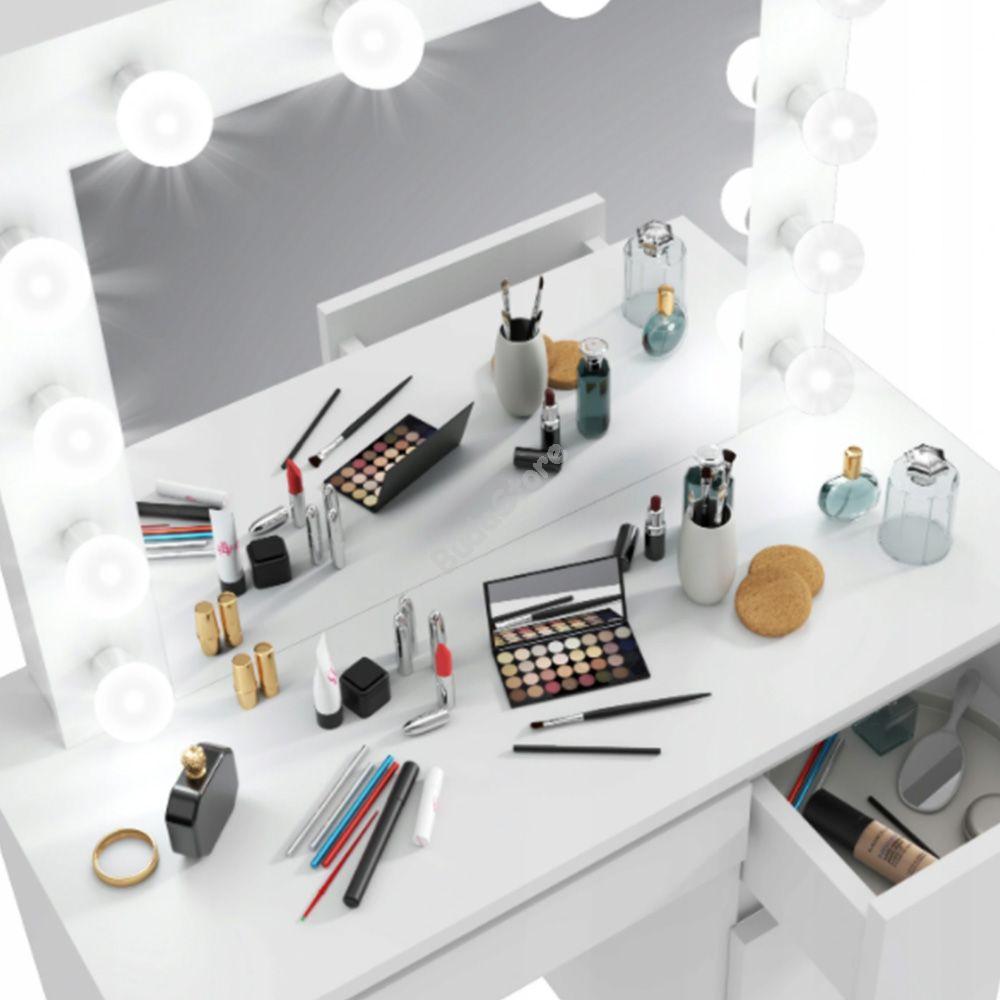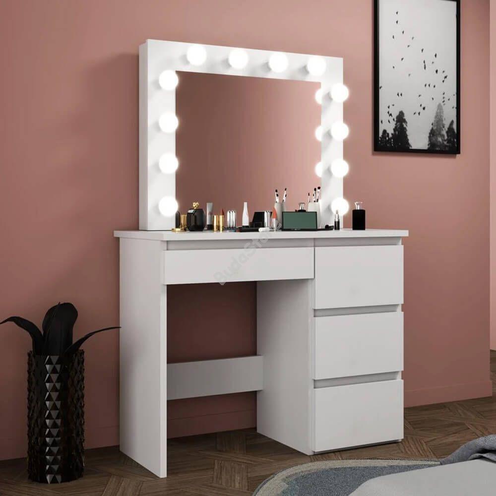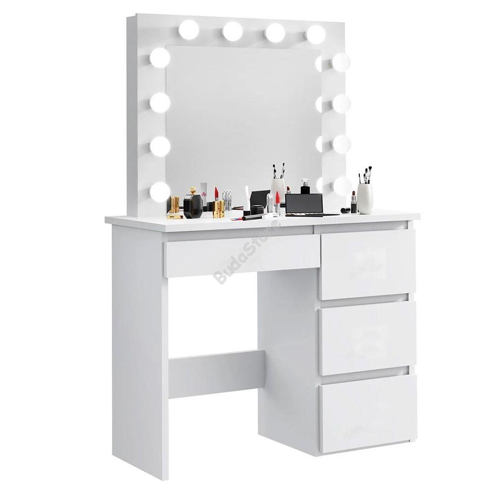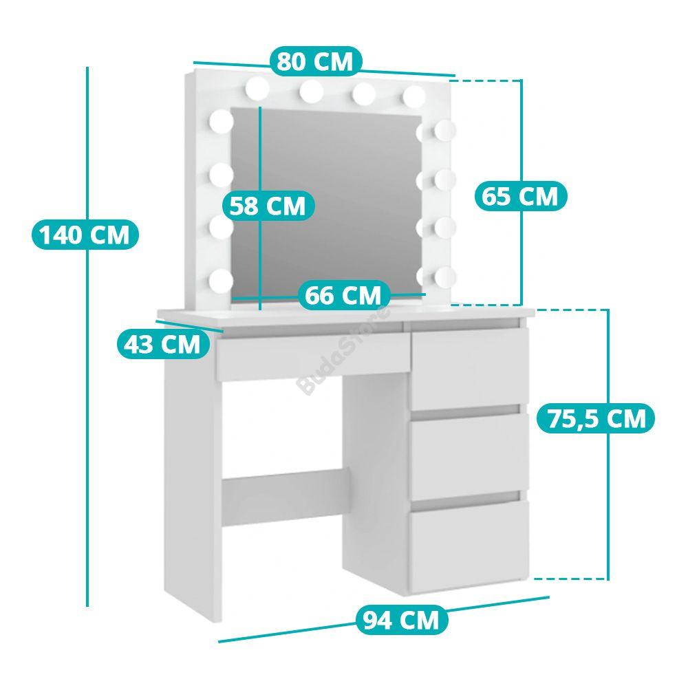 A nagy méretű tükör körül állítható fényerejű LED-lámpák kaptak helyet, így biztosan megfelelően tudod elkészíteni a napi sminked vagy hajkoronád. 4 fiókos kialakításával minden kiegészítőnek találsz helyet, így nem kell többé keresgélned és egy helyen tárolhatod ékszereidet, sminkjeidet, hajformázó eszközeidet és egyéb szükséges kelléket.