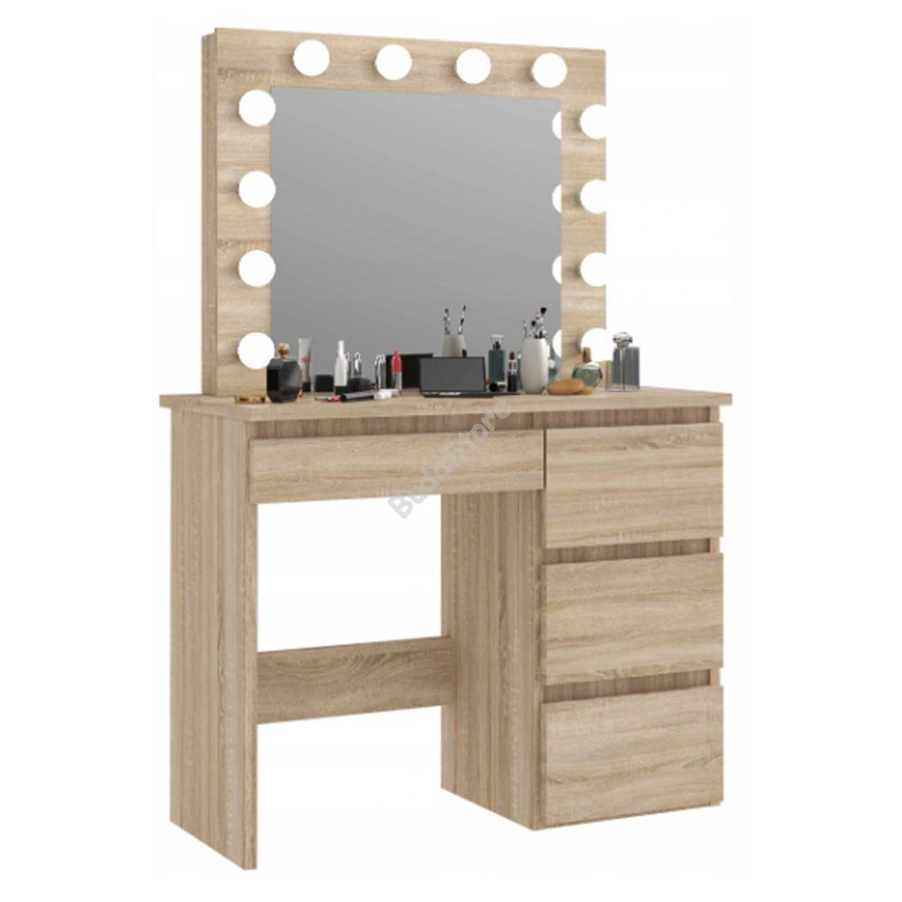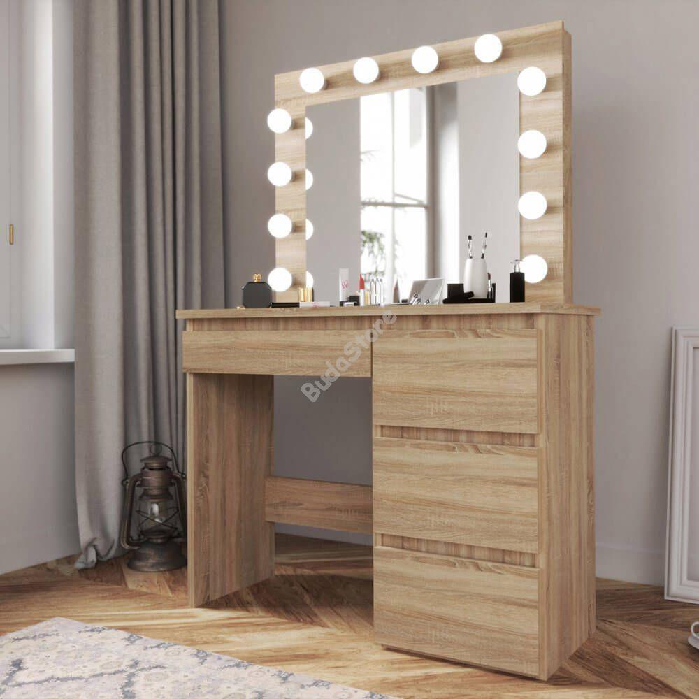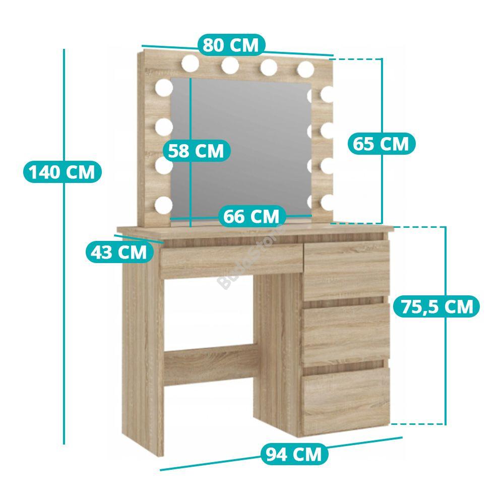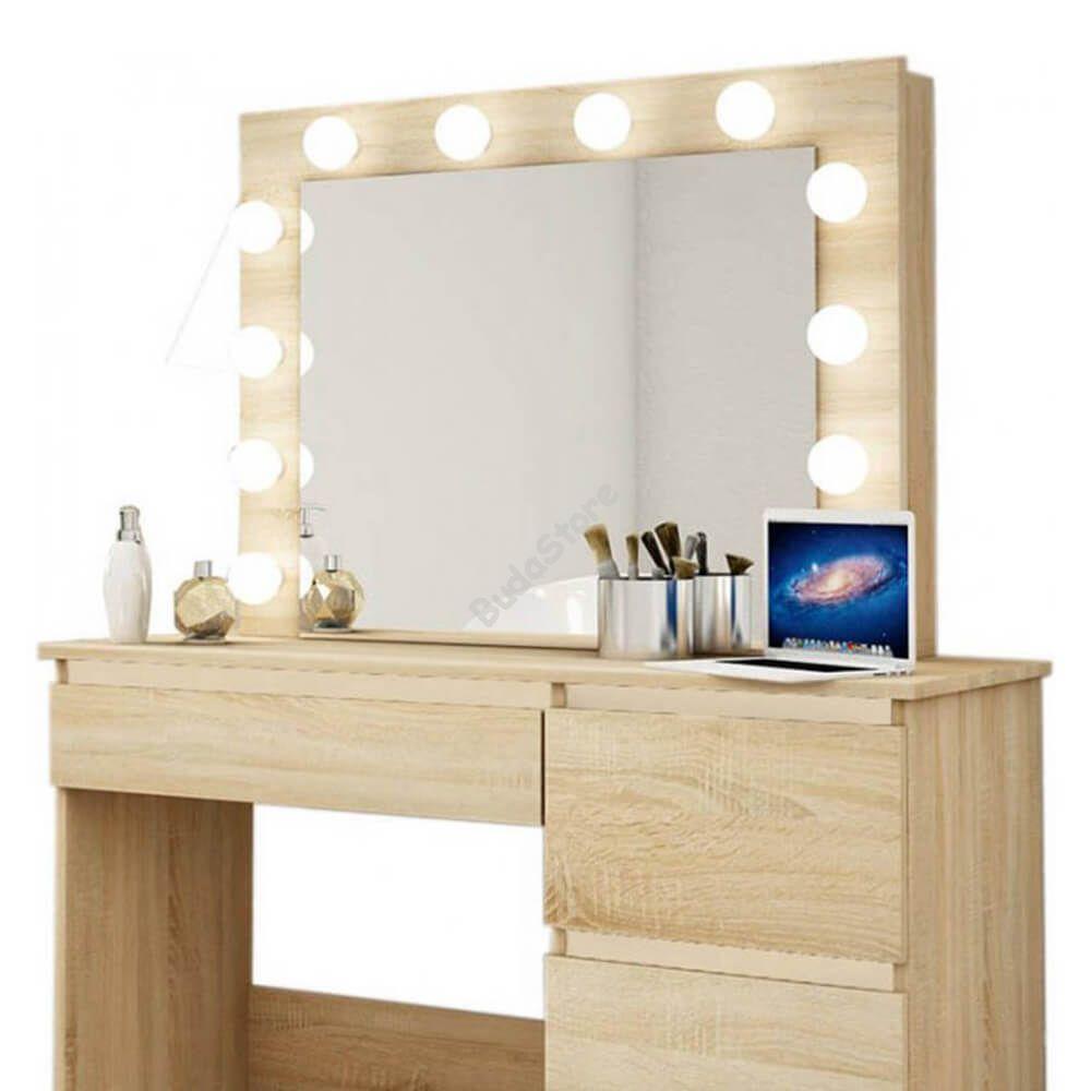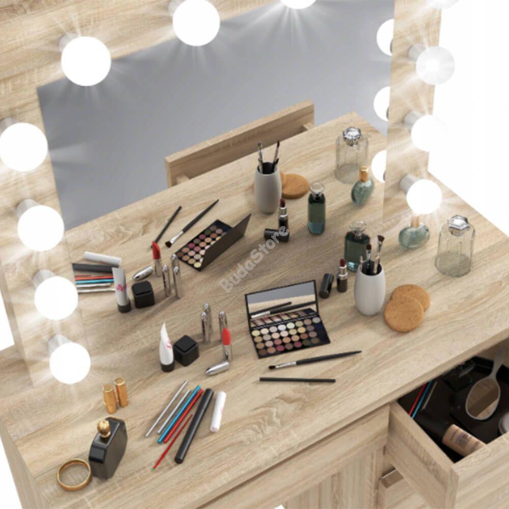A nagy méretű tükör körül állítható fényerejű LED-lámpák kaptak helyet, így biztosan megfelelően tudod elkészíteni a napi sminked vagy hajkoronád. 4 fiókos kialakításával minden kiegészítőnek találsz helyet, így nem kell többé keresgélned és egy helyen tárolhatod ékszereidet, sminkjeidet, hajformázó eszközeidet és egyéb szükséges kelléket.