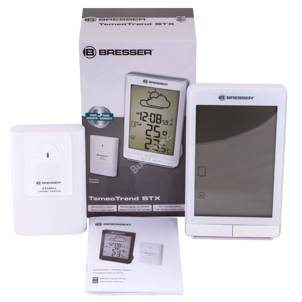 Bresser TemeoTrend STX RC időjárás állomás fehér 73271 22 790 Ft / db [2 db 2%] [5 db 3%] [10 db 5%] Gyártó: Bresser Cikkszám: S101_73271 Súly: 0,36 kg Átvétel: Ez a termék boltunkban személyesen is átvehető. The Bresser TemeoTrend STX radio-controlled weather station shows on a clearly structured display next to the current time, which is transmitted via DCF radio signal, also information on indoor and outdoor temperature. The outdoor data is captured and transmitted to the weather station by the included remote sensor. In addition, the radio-controlled weather station is equipped with an animated weather trend indicator, so that you are always up to date about the current weather forecast. Further helpful features are the wake-up alarm just as well as the snow alert, which informs you in form of a symbol on the display when the outside temperature is between 3°C and –2°C. Features: Clearly structured display Indoor and outdoor temperature indicator Animated weather trend indicator Time via DCF radio signal Wake-up alarm with snooze function Memory for min./max. values of temperature (inside and outside) Snow symbol indicates a temperature between 3°C and -2°C Amber backlight Supports up to 3 outdoor sensors (1 already included!) 433MHz transmission frequency Range of the sensor up to 50m The kit includes: Weather station Remote sensor User manual MárkaBresser GmbH, NémetországSzavatosság2 évEAN4007922054551A csomag méretei (HxSzxM):18x10x7 cmSzállítási súly0.36 kgFelhasználás helyebeltéri, kültériTípusidőjárás-állomásBeépített funkciókhőmérő, ébresztőóra, óraKialakításasztallapi, digitális, falra szerelt, vezeték nélküliHasználatotthoni használatra=== Elválasztójel ===Hőmérő (hőmérséklet)Mértékegységek°C, °FMérési tartomány beltéren-5...+50 °CMérési tartomány beltéren-5 — 50Mérési tartomány kültéren-20...+60 °CMérési tartomány kültéren-20 — 60Rendeltetésfigyelmeztetés havazásra: –2 °C to +3 °C közötti hőmérsékletnél jelzés megjelenítése=== Elválasztójel ===Óra (idő/dátum/naptár)ÓrayesIdőformátum12 órás, 24 órásÉbresztőórayesAutomatikus szinkronizációDCF (CET)Rendeltetésszundi funkció az ébresztéshez=== Elválasztójel ===Általános műszaki jellemzőkKépernyő típusaegyszínűKépernyők száma1Képernyők száma1Rádiójelek frekvenciája, MHz433Rádiójelek hatósugara, m30TápellátásAA elemek, 1,5 V (a készlet nem tartalmazza): időjárás-állomás – 2 db, kültéri érzékelő – 2 dbVázműanyagVázszínfehérMűködési hőmérséklet-tartomány (beltéren), °C0 — 50Üzemi hőmérséklet-tartomány (külső érzékelő)-20 — 60Csatlakoztatott kültéri érzékelők számaakár 3 db (1 db mellékelve)VilágítássalyesMegvilágítássárgaElérhető meteorológiai trendyesMeteorológiai trenda következő 12 óráraVezeték nélküli érzékelőyes Mennyiség db Nem rendelhető