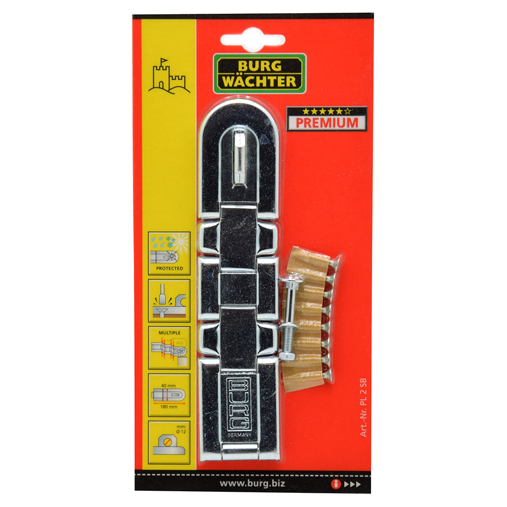 BURG WACHTER PL2 dupla csuklós biztonsági lakatpánt PL 2 6 720 Ft / db [2 db 2%] [5 db 3%] [10 db 5%] Gyártó: BURG WACHTER Cikkszám: S005_BW02211 Vonalkód (EAN13): 4003482022115 Súly: 0,27 kg Átvétel: Ez a termék boltunkban személyesen is átvehető. Burg Wachter PL 2 SB dupla csuklós biztonsági lakatpánt BW02211 edzett, acél lakatpánt edzett lakatszem erős dupla csuklóval időjárásálló horgonyzás rejtett csavarfuratok exkluzív kivitel többféle méretben SB: bliszter csomagolás, csavarokkalTulajdonságokMagasság:180 mmSzélesség:40 mmMélység:12 mmTömeg:0,27 kg Mennyiség db Kosárba tesz