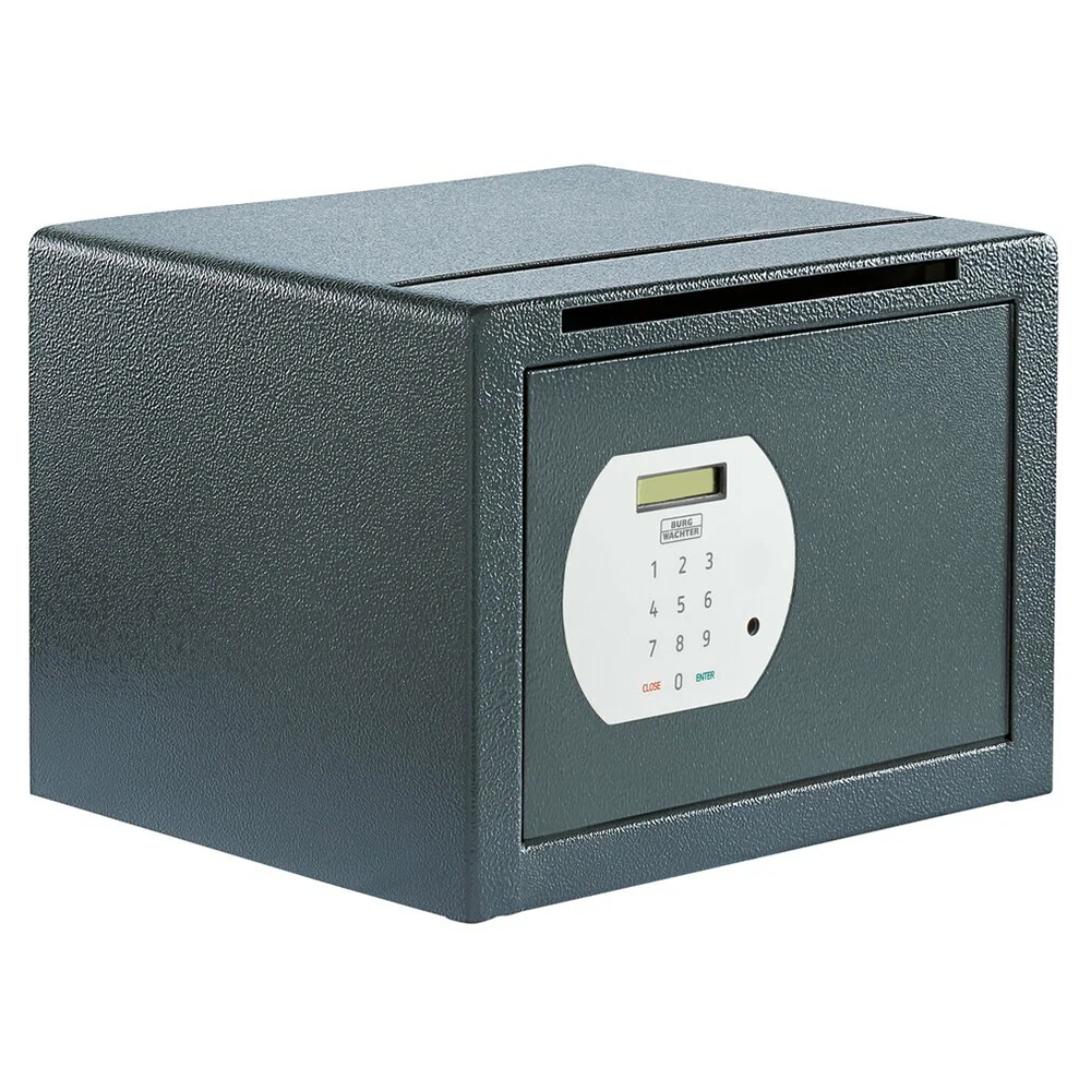 Burg Wachter PS 120 E EWS dupla bedobónyílásos elektronikus széf BW49110 82 810 Ft / db [2 db 2%] [5 db 3%] [10 db 5%] Gyártó: Burg Wachter Cikkszám: S005_BW49110 Vonalkód (EAN13): 4003482491102 Súly: 12,80 kg Átvétel: Ez a termék boltunkban személyesen is átvehető. Burg Wachter PS 120 E EWS dupla bedobónyílásos elektronikus széf BW49110megbízható bútorszéf két bedobónyílássalnagyobb méretű bedobónyílás a széf tetején (325 mm x 10 mm)kisebb méretű bedobónyílás az ajtó felett (240 mm x 10 mm)bankjegyek, borítékok, A4-es iratok gyors elzárásához2 mm-es egyfalú acél test48 mm vastag ajtó, 6 mm-es acél borítással90 fokos ajtónyitás jobboldali zsanérokkalegyirányú zárás 22 mm-es acél hevederekkelmotoros működtetésű elektronikus számzárfólia billentyűzet egysoros LCD kijelzővel3-6 számjegy közötti felhasználói kód és8 számjegyű vésznyitó kód programozásamechanikus vésznyitási lehetőség tűkulccsal3 téves kódbevitel után 5 perces büntetőidőzár 4 db Mignon LR 6 AA 1,5V elemmel működikrögzítő furat lefelé és hátrafelévésznyitó nyerskulcs típusa: Rohling 53XTulajdonságokZárszerkezet:ElektronikusMagasság:255 mmSzélesség:350 mmMélység:300 mmBelső magasság:251 mmBelső szélesség:346 mmBelső mélység:238 mmAjtó magasság:183 mmAjtó szélesség:231 mmPolc:1 dbŰrtartalom:20.7 lTömeg:12,8 kgMABISZ:S1 Mennyiség db Kosárba tesz