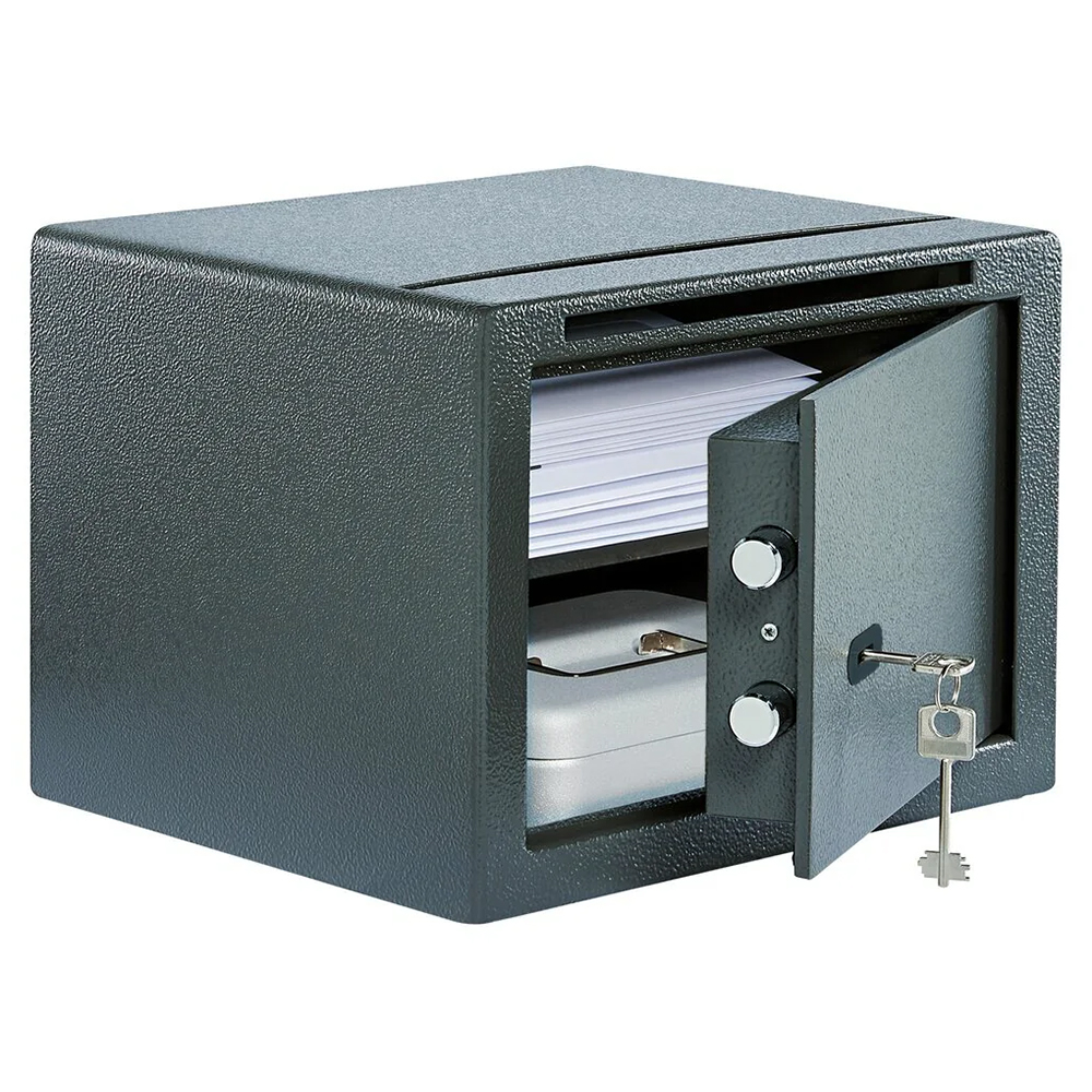 Burg Wachter PS 120 K EWS dupla bedobónyílásos kulcsos széf BW49100 60 060 Ft / db [2 db 2%] [5 db 3%] [10 db 5%] Gyártó: Burg Wachter Cikkszám: S005_BW49100 Vonalkód (EAN13): 4003482491003 Súly: 12,70 kg Átvétel: Ez a termék boltunkban személyesen is átvehető. Burg Wachter PS 120 K EWS dupla bedobónyílásos kulcsos széf BW49100megbízható bútorszéf két bedobónyílássalnagyobb méretű bedobónyílás a széf tetején (325 mm x 10 mm)kisebb méretű bedobónyílás az ajtó felett (240 mm x 10 mm)bankjegyek, borítékok, A4-es iratok gyors elzárásához2 mm-es egyfalú acél test48 mm vastag ajtó, 6 mm-es acél borítással90 fokos ajtónyitás jobboldali zsanérokkalegyirányú zárás 22 mm-es acél hevederekkelSecu 6 lamellás duplatollú kulcsos zár15.000 feletti zárási variációvalkettő darab 76 mm-es kulccsalrögzítő furat lefelé és hátrafelényerskulcs típusa: Rohling 17CTulajdonságokZárszerkezet:KulcsosMagasság:255 mmSzélesség:350 mmMélység:300 mmBelső magasság:251 mmBelső szélesség:346 mmBelső mélység:238 mmAjtó magasság:183 mmAjtó szélesség:231 mmPolc:1 dbŰrtartalom:20.7 lTömeg:12,7 kgMABISZ:S1 Mennyiség db Kosárba tesz