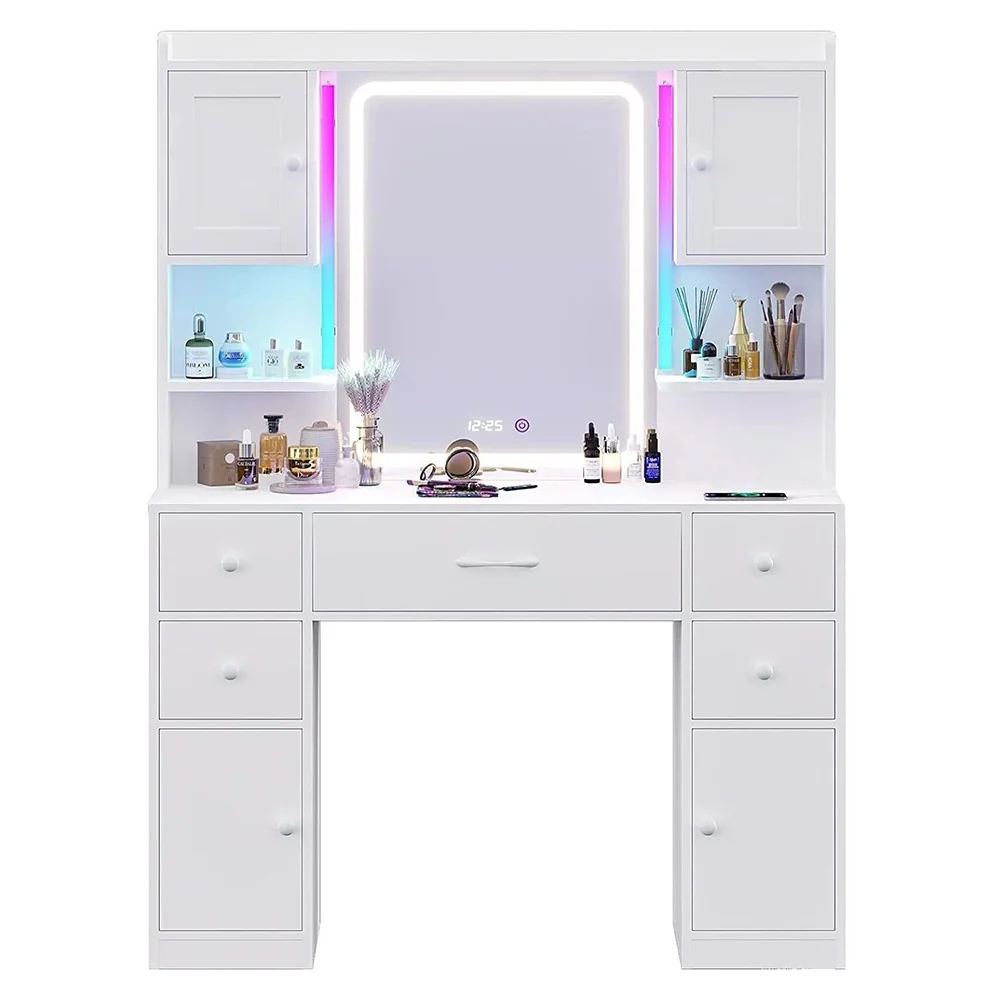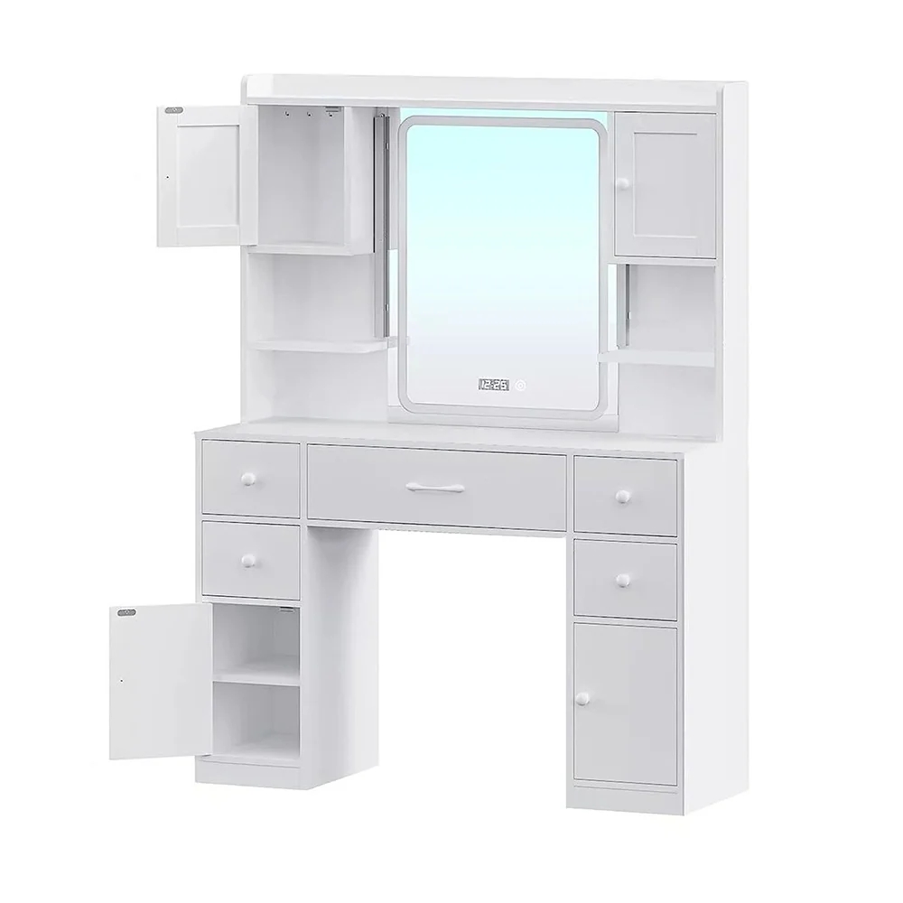 Az asztalban található polcos tárolók és fiókok extra helyet kínálnak a kisebb tárgyak rendszerezett tárolására. Legyen szó sminkecsetekről, ékszerekről vagy hajápolási eszközökről, minden elfér benne, így könnyedén fenntarthatod a rendet, miközben minden fontos tárgy elérhető közelségben marad.