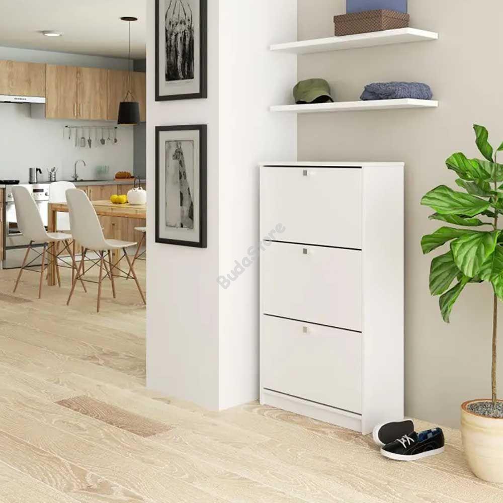 3 részes kialakításával kényelmesen és praktikusan tarthatod lábbelijeid és az egész család számára kényelmes megoldást jelent. Alkalmas előszobába, közlekedőbe de akár irodába is hasznos lehet. Praktikus, keskeny kivitelezésének köszönhetően  nem vesz el sok helyet a térből. Tetejét dekorelemekkel teheted színesebbé, és pakolhatsz tetejére egyebeket is.