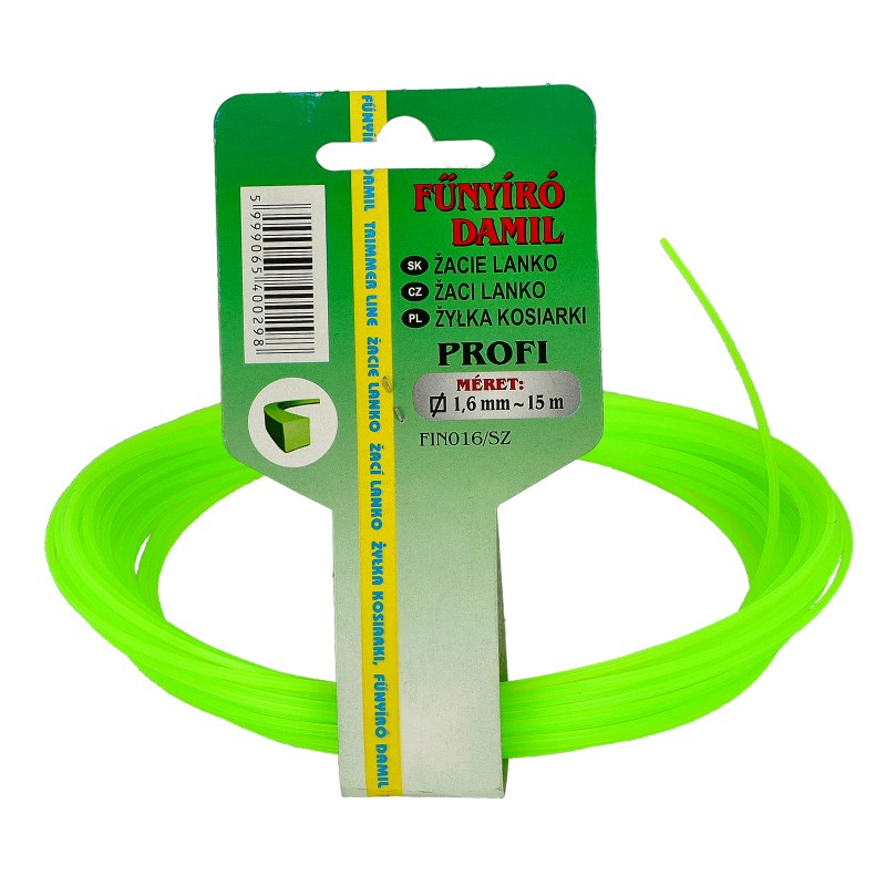 Damil 1.6mm szögletes 15 méter olasz FIN016/SZ 1 640 Ft / db [2 db 2%] [5 db 3%] [10 db 5%] Gyártó: EGYÉB Cikkszám: S006_FIN016/SZ Átvétel: Ez a termék boltunkban személyesen is átvehető. 15 méteres 1.6 mm átmérőjű szögletes profilú damil damilfejbe. Átmérő:1,6 mm Hossz:15 m Profil:szögletes Kiszerelés:tekercs Csomagolási egység:100db/karton, 2400db/raklap Típusok: 15 méter: Mennyiség db Kosárba tesz