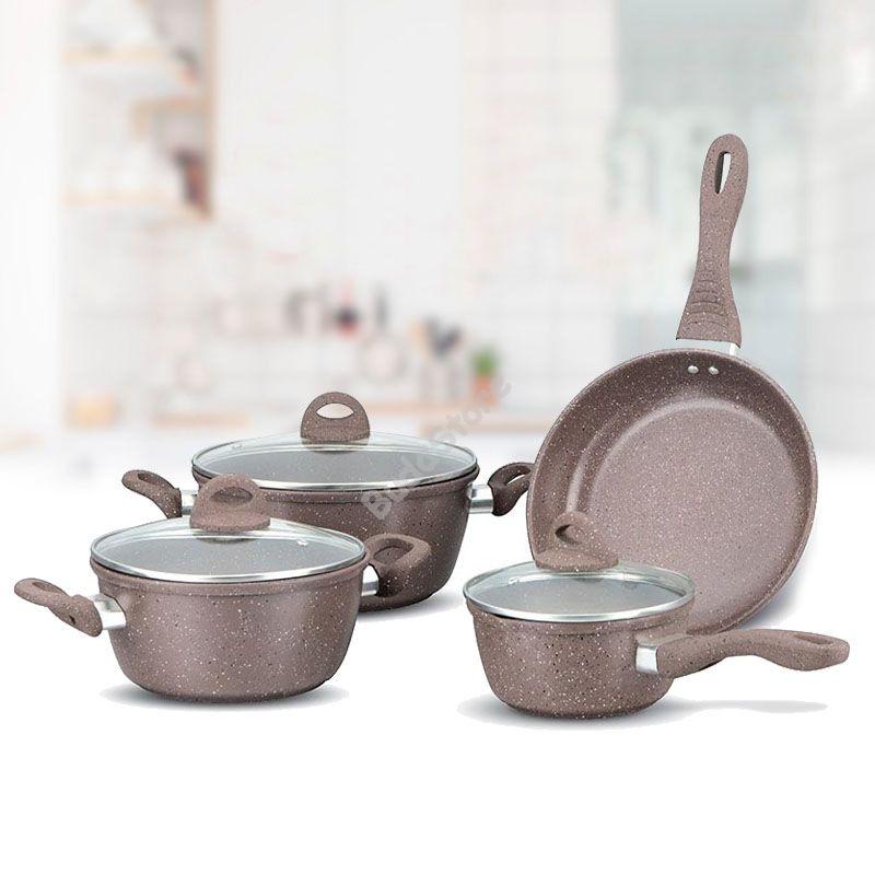 A 7 darabos edénykészlet préselt acélból készült és biztonságos, hőálló, valamint 2 rétegű tapadásmentes bevonattal rendelkezik. A tűzálló alumínium foganytúi kényelmes főzést biztosítanak hiszen nem forrósodnak fel. A készlet darabjait egészen 400 celsius fokig lehet felmelegíteni.