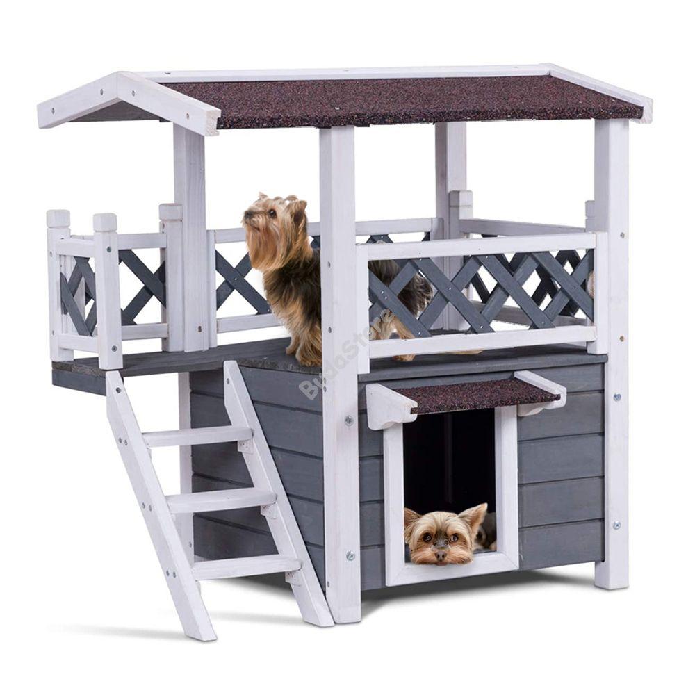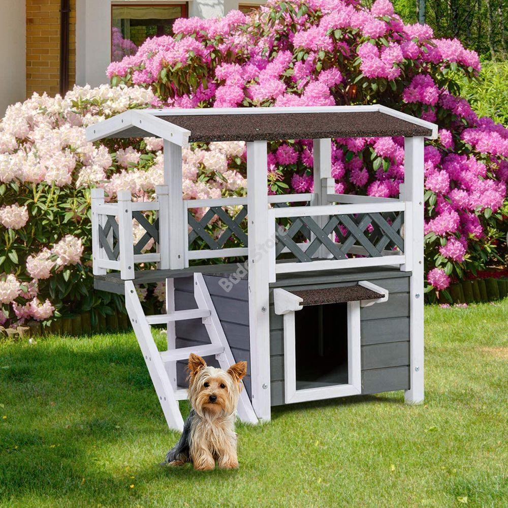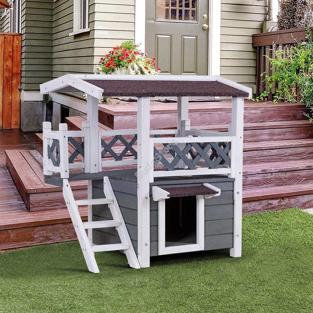 Egy kutyaház vagy cicaház megóvja a háziállatokat az időjárás viszontagságaitól, télen meleg és száraz menedéket biztosít, nyáron pedig megvéd a káros napsugaraktól és lehetővé teszi, hogy a kis kedvencek hűsöljenek. Minden háziállat igénye egy nyugodt hely, ahová kényelmesen elvonulhat, egy kinti ház erre tökéletesen alkalmas. Az emeletes kutyaház vagy cicaház a hagyományostól eltérő módon, egy felső emelettel is rendelkezik, amely még több életteret biztosít a házikedvenceknek. A ház kezeletlen festett fa anyagból készült. Kistestű kutyák és cicák számára tervezték, körülbelül 5 kg-os háziállat használhatja kényelmesen.