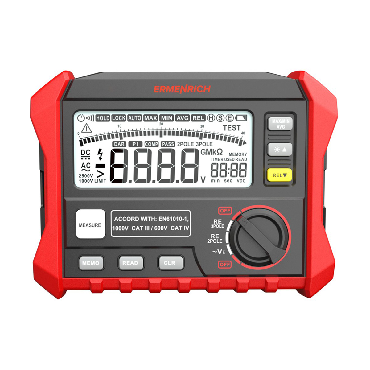 Ermenrich Ping ET60 földelési ellenállás-vizsgáló 82961 61 740 Ft / db [2 db 2%] [5 db 3%] [10 db 5%] Gyártó: ERMENRICH Cikkszám: S101_82961 Súly: 2,34 kg Átvétel: Ez a termék boltunkban személyesen is átvehető. Az Ermenrich Ping ET60 egy földelési ellenállás-vizsgáló, amelyet 0–4 kΩ közötti földelési ellenállás mérésére terveztek. Beépített LCD-képernyővel, három – különböző hosszúságú – tesztkábellel, valamint két földelőpálcával rendelkezik. Az eszköz elemekkel működik, automatikus kikapcsolási funkcióval rendelkezik, és jelzi a felhasználónak, ha az elemeket az alacsony töltöttségi szint miatt ki kell cserélni. Érdemes a berendezések méréseit és diagnosztikáit nagy elemtöltöttségi szinttel végezni, máskülönben az eredmények pontatlanok lehetnek. Az eszköz eltárolja a méréseket a memóriában, rögzíti a maximális, minimális és átlagértékeket, valamint egy referencia érték segítségével relatív méréseket végez. Az adattartási funkciónak köszönhetően az eszköz képes a mérési eredményeket „befagyasztani” a képernyőn (értsd: nem veszi le őket a képernyőről) olyan helyzetekben, amikor Önnek később dolgoznia kell ezekkel az eredményekkel. Az Ermenrich Ping ET60 egy mérőeszköz, amely áramelosztó vezetékek tesztelésére, villámvédelmi rendszerek tervezésére, valamint nagyfeszültségű oszlopok, épületek, kommunikációs állomások, belső vezetékek, elektromos berendezések stb. diagnosztizálására használható. Magas fokú mérési pontosság jellemzi, és professzionális munkavégzésre is alkalmas. Főbb jellemzők: Földelési ellenállás mérése a DC (egyenfeszültség) átalakítási módszerrel Földelési feszültség mérése a numerikus egyenirányítási átlagolási módszerrel Memória 100 mérési csoportnak, valamint a minimális, maximális és átlagértékek tárolására A mért érték megtartása a képernyőn, kalkuláció referencia értékek alapján Szabványos elemekkel történő működés, automatikus kikapcsolási funkció, alacsony töltöttségi szintre vonatkozó figyelmeztetés A készlet tartalma: Földelési ellenállás-vizsgáló Tesztkábelek – 3 db Kiegészítő földelőpálcák – 2 db Hordtáska Felhasználói kézikönyv és garanciajegy MárkaErmenrichSzavatosság5 évEAN5905555027326A csomag méretei (HxSzxM):9x27x33 cmSzállítási súly2.34 kgFöldelési ellenállás méréstartománya0–29,99 Ω: hiba (±2%+6), felbontás 0,01 Ω 30–99,9 Ω: hiba (±3%+3), felbontás 0,1 Ω 100–999 Ω: hiba (±3%+3), felbontás 1 Ω 1,00–4,00 kΩ: hiba (±3%+3), felbontás 10 ΩFöldelési feszültség0–200 V (50–60 Hz): pontosság (±1%+5), felbontás 0,1 VMérési módszerkétvezetékes, háromvezetékesFöldelési ellenállás mérési paramétereitesztáram 3 mA, 800 HzMemória100 csoportÁtlagérték-memória (AVG)yesRelatív érték mérése (REL)yesTúlfeszültség kategóriakat. III (1000 V), kat. IV (600 V)KépernyőigenKijelző háttérfényyesGrafikus skálayesBiztonsági szabványokEN61010-1, EN61557-3, EN61326-1Adatmentési/-olvasási funkcióyesAdattartási funkcióyesHatárérték-memória (Min/Max)yesTápellátás8 db AA elem (a készlet nem tartalmazza)Lemerülőben lévő elem jelzőlámpájayesAutomatikus kikapcsolásyes Mennyiség db Nem rendelhető