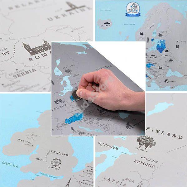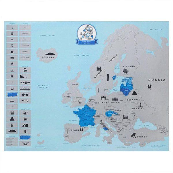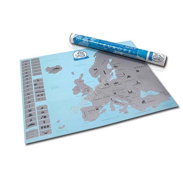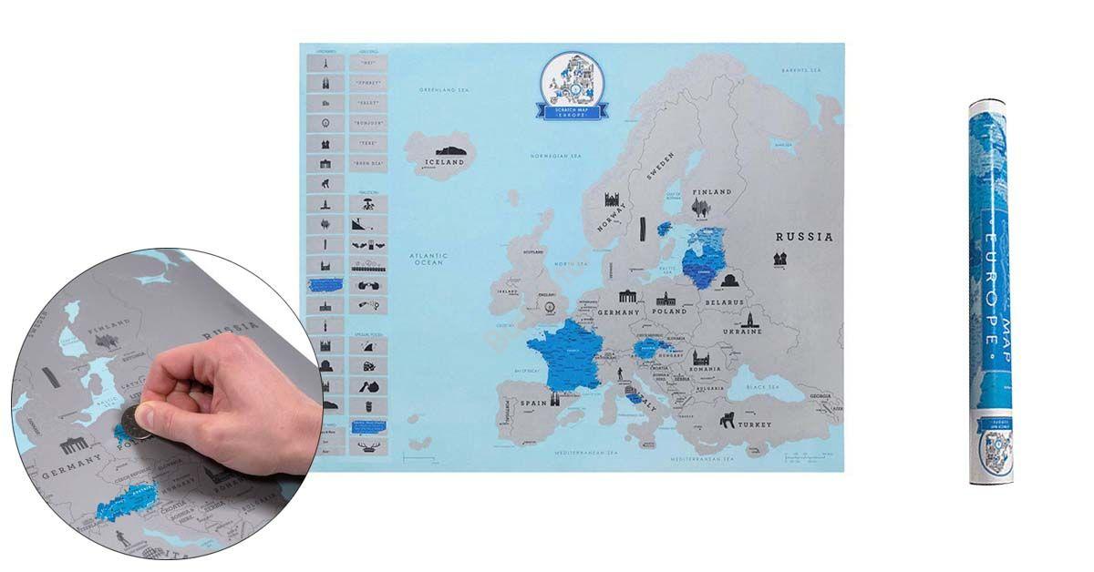 Az ezüstfóliával bevont kaparós térkép olyan, mint az egyszerű sorsjegy. Ha jártál valahol Európában, egyszerűen csak kapard le azt a területet egy pénzérmével. Különböző színekkel különülnek el a lekapart felületek, így minél többet kaparsz, annál látványosabb.