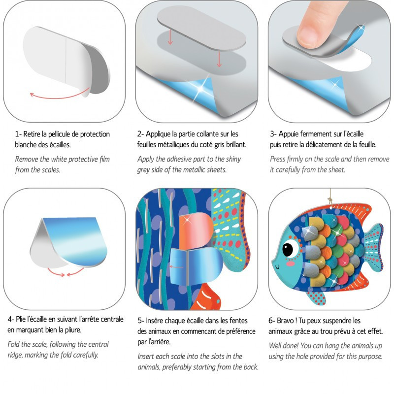 Fényes pikkelyek kreatív készlet, Tengeri állatok CreaLign CL188 4 990 Ft / db [2 db 2%] [5 db 3%] [10 db 5%] Gyártó: CREALIGN' Cikkszám: S140_CL188 Vonalkód (EAN13): 3760119714126 Súly: 0,42 kg Készíts fényes tengeri állatfigurákat a CreaLign legújabb készletével!Készítsd el a fényes pikkelyeket, majd illeszd azokat az előre kivágott résekbe, így mesés, szemetgyönyörködtető dekorációkat hozhatsz létre.A készletben minden megtalálható, amire szükséged lesz:- 3 kartonfigura- színes fényes fóliák- 64 pikkely alakú lap Jellemzők Korcsoport: 3 éves kortól Kinek ajánljuk: Lányoknak és fiúknak Mennyiség db Nem rendelhető