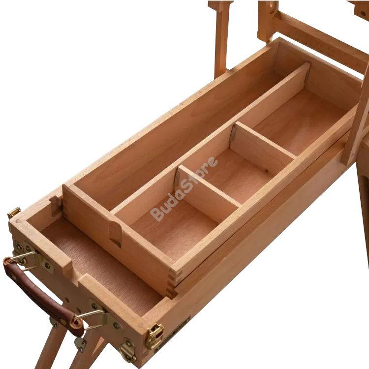 Fából készült, 3 lábú festőállvány kezdő kis művészek részére. Összecsukható, kézben és vállon is hordozható, könnyen összeszerelhető állvány, amit rajzolásra, festésre is használhatunk. Közepén egy tálca található, melyekben ecsetet, festéket, egyéb kellékeket tárolhatunk. Tartozék egy falemezből készült paletta is, melyen kikeverhetjük a tökéletes színeket az alkotáshoz.