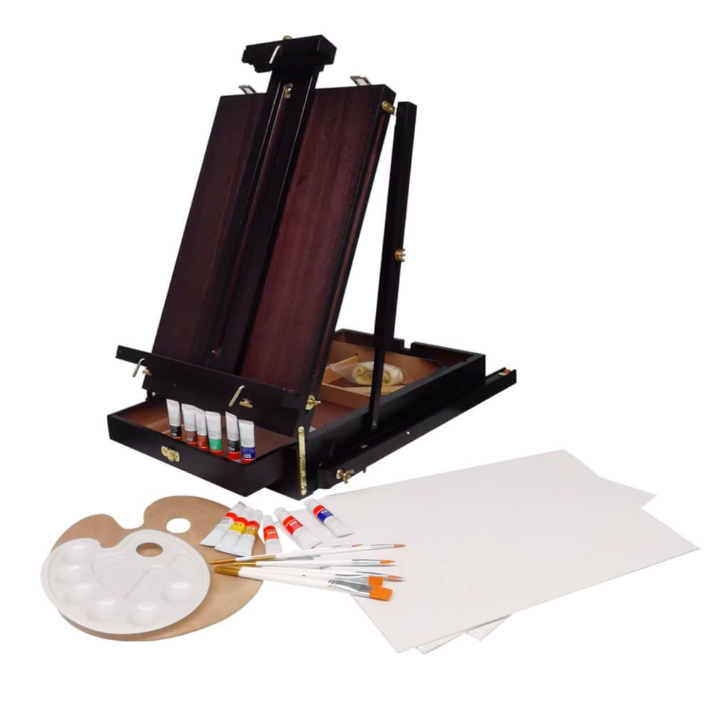 Ez a festőállvány szett kiegészítőkkel tökéletes választás kezdő és gyakorlott festők számára egyaránt. A masszív, fából készült állvány nemcsak stabil tartást biztosít, de könnyedén összecsukható és hordozható is, így bárhol alkothatsz, ahol csak kedved tartja.