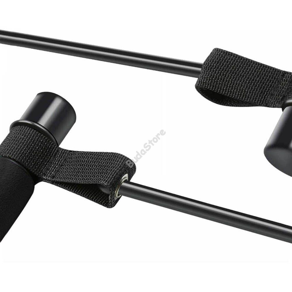 A gumiszalagos fitnesz rúd tökéletesen alkalmas dinamikus mozgások ellenállásának növelésére. Méretének köszönhetően könnyen hordozható, hiszen szétszerelhető,így akár egy táskában is elfér. A rúdhoz kapcsolódó gumiszalag végén található hurkokba behelyezzük lábunkat, és már végezhetjük is a gyakorlatok széles skáláját az edzőteremben, vagy akár otthonunkban is. Segítségével olyan gyakorlatokat hajthatunk végre, amelyek növelik az ízületek mozgásterét és a motorikus koordinációt és fejlesztik.