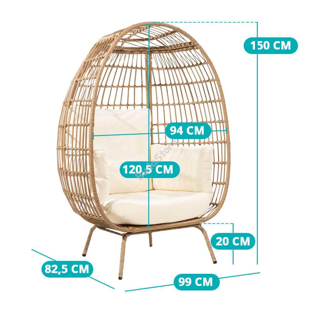 Fonott, rattan fotelünk párnázott ülőfelületével gondoskodik a maximális kényelmedről és stílusos kiegészítője lesz kertednek, teraszodnak vagy akár nappalidnak is. Széles kialakításának köszönhetően kényelmesen bekuckózhatsz pihenni vagy olvasni is. A szék váza fémből készült, a lábakon elhelyezett csúszásgátló bevonat megvédi a padlózatot és a szék lábait egyaránt a karcolódástól. Vastag, párnázott ülőfelülete rendkívüli kényelmet garantál. A párnahuzat cipzárral van ellátva, így könnyen levehető, 30 C°-on mosható, 110 C°-on vasalható. Lehetőség szerint tisztítás után fogason, függőlegesen szárítsd. A párnahuzat nem fehéríthető.