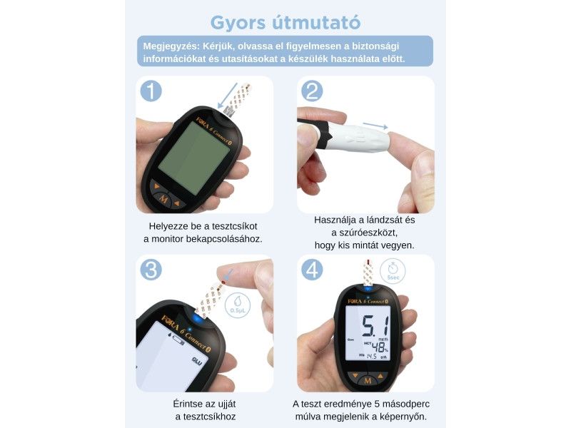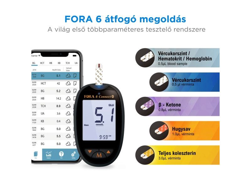 FORA 6 multifunkciós diagnosztikai mérőkészülék 13 380 Ft / db [2 db 2%] [5 db 3%] [10 db 5%] Gyártó: FORA Cikkszám: S040_03.2.5559.00 Súly: 0,50 kg FORA 6 multifunkciós diagnosztikai mérőkészülék A FORA 6 multifunkciós diagnosztikai mérőkészülék egy korszerű, többparaméteres egészségügyi mérőrendszer, amely lehetővé teszi több fontos laborérték gyors és pontos meghatározását otthoni használat vagy egészségügyi környezet számára. A készülék különböző FORA tesztcsíkokkal kompatibilis, így rugalmas és költséghatékony megoldást kínál a rendszeres ellenőrzéshez. Rendelhető Tesztcsíkok: FORA 6 vércukormérő tesztcsík, 50db FORA 6 3az1-ben tesztcsík (vércukor + hematokrit + hemoglobin), 25db FORA 6 ß-keton tesztcsík, 10db FORA 6 húgysav tesztcsík, 10db FORA 6 teljes koleszterin tesztcsík, 10db Főbb jellemzők és előnyök Multifunkciós mérőrendszer – több paraméter egy készülékkel Gyors mérési eredmények (néhány másodpercen belül) Kis mennyiségű vérmintát igényel Automatikus tesztcsík-felismerés Nagy, jól olvasható kijelző Egyszerű, felhasználóbarát kezelés Otthoni és professzionális használatra egyaránt alkalmas Klinikailag tesztelt pontosság Mennyiség db Kosárba tesz