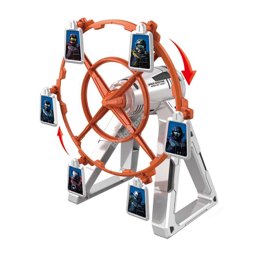 A forgó célbalövő játékkal valódi akcióban lehet részük a gyerekeknek. A játék bekapcsolása után az állványra helyezett tárcsa forogni kezd, ezzel folyamatos mozgásban tartva a mágnessel felhelyezhető célpontokat. A csomag 1 darab pisztolyt tartalmaz amelyre tölténytár rögzíthető, ezzel nyújtva még realisztikusabb játékélményt. A mágneses célpontok akciófigurákat ábrázoló matricával vannak ellátva, amelyekre a gyerekek könnyű szivacstöltényekkel lőhetnek.