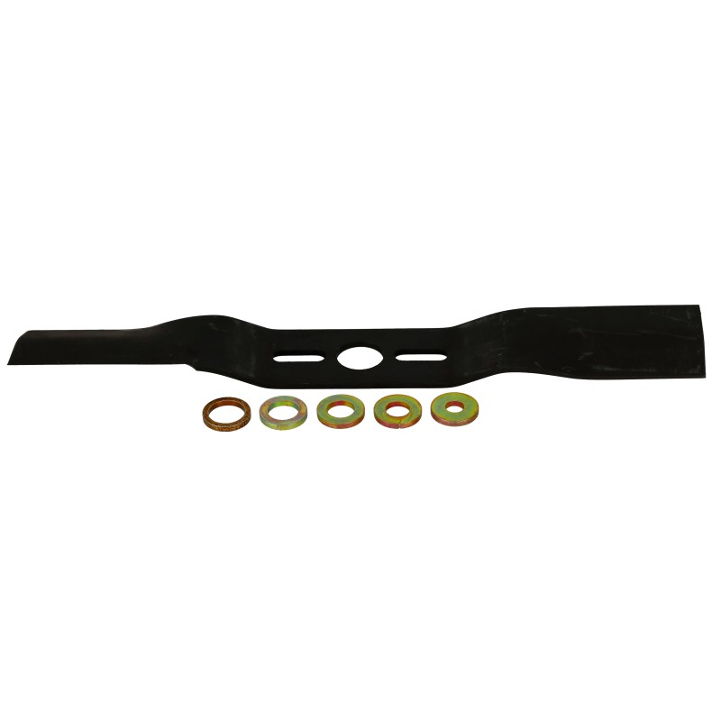 Univerzális, hajlított fűnyírókés, 5 darab különböző méretű szűkítő betétgyűrűvel.