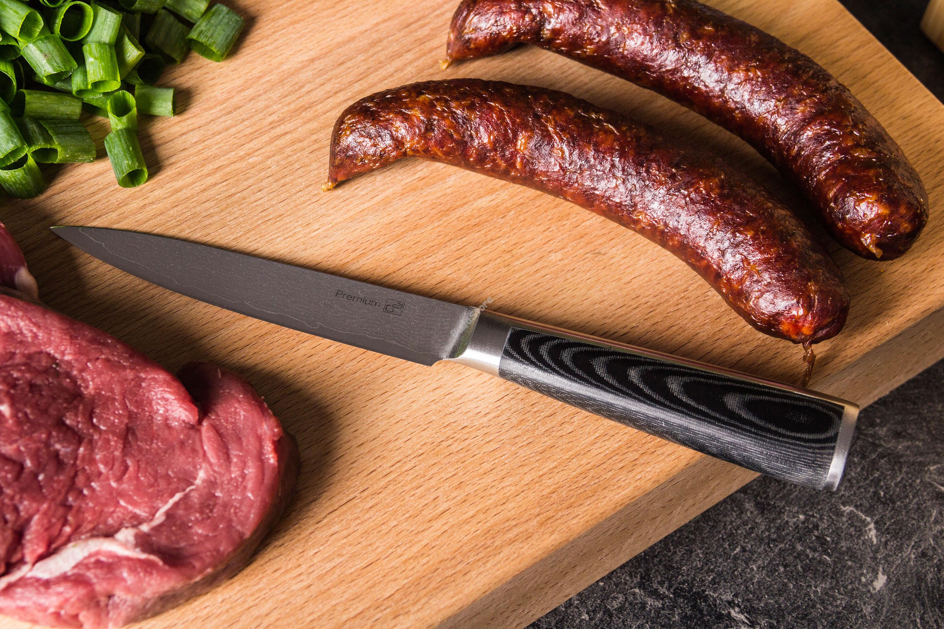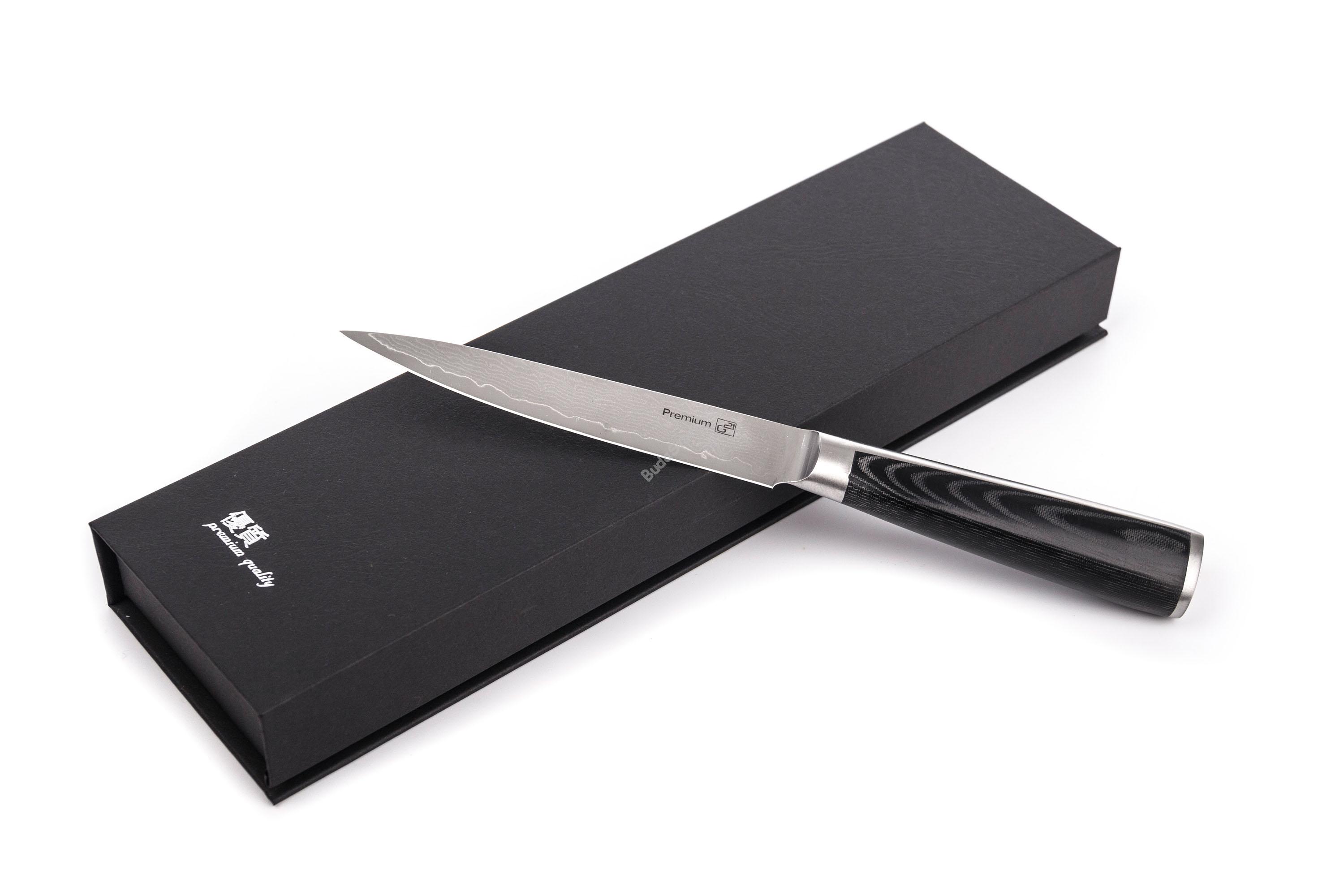 G21 Damascus Premium kés 13cm 600227 18 390 Ft / db [2 db 2%] [5 db 3%] [10 db 5%] Gyártó: G21 Cikkszám: S100_600227 Vonalkód (EAN13): 8595627421984 Súly: 1,00 kg G21 Damascus Premium kés 13cm 600227 A minőséges G21 Gourmet Damascus Premium13 cm-es univerzális, damaszkuszi acélból készült kés tökéletesen fog szeletelni. A kés pengéje minőséges 67 rétegű damaszkuszi VG-10 acélból készült. A kés markolata extra erős anyagból készült, ún. Micrata. A termék leírása Kés damaszkuszi acélból a konyhában? Igen, ez a tökéletes választás. A damaszkuszi acél erősebb és tartósabb a sima acéllal szemben, ráadásul az egyedi acél mintának köszönhetően luxus kiegészítőjévé válik a konyhájának. A minőséges G21 Gourmet Damascus Premium 13 cm-es univerzális, damaszkuszi acélból készült kés tökéletesen fog szeletelni, vágni. Az átlagos főzésből szórakozás válik, melyet minden szakács és haspók értékelni fog. Minőséges anyag és kialakítás A G21 Gourmet Damascus Premium kés pengéje minőséges 67 rétegű damaszkuszi VG-10 acélból készült, mely rendkívül ellenálló, stabil és hihetetlenül hosszú élettartammal rendelkezik. A rétegezett damaszkuszi acélt fegyverkészítéshez is használták. A damaszkuszi acél kettő, vagy több különféle acél egyvelege, mely egy egészet alkot. Ezek eredménye egy nagyon erős, ellenálló, ráadásul törésmentes anyag. Ezen anyagnak köszönhetően a G21 Gourmet DamascusPremium kés éles, ellenálló, tartós és megfelelő karbantartás mellett több évtizedig is jó szolgálatot tehet. A kés markolata extra erős és ellenállót laminált anyagból készült, ún. Micrata. A micrata egy rétegelt szerkezetű, műgyantával kiöntött alapanyag, melyben nem üvegszál, hanem természetes alapanyag biztosítja a rétegeket. Így készült ez az erős,kemény markolat, mely nem enged az idő múlásának. A kés sima, egyenes, tiszta kialakítása minden konyha díszévé válik. Meghosszabbított garancia 2+2 év A termék minőségét 4 évig garantáljuk. A + 2 év garanciális időszakért kérjük regisztráljon a http://g21-warranty.com oldalon. Használja ki ezt a lehetőséget és regisztráljon egyből vásárlás után. Paraméterek Márka: G21 Model: Gorumet Damascus Premium 13 cm Meghatározás: konyhai kés Penge hossza: 13 cm Anyag: 67 rétegű damaszkuszi acél, VG-10 Keménysége: 60 HRC Markolat anyaga: Micrata 2+2 év garancia (a http://g21-warranty.com oldalon való regisztráció után) Csomagolás méretei: 30 x 4 x 9 cm A csomagolás súlya: 0,3 kg Certifikáció: LFGB Mennyiség db Kosárba tesz