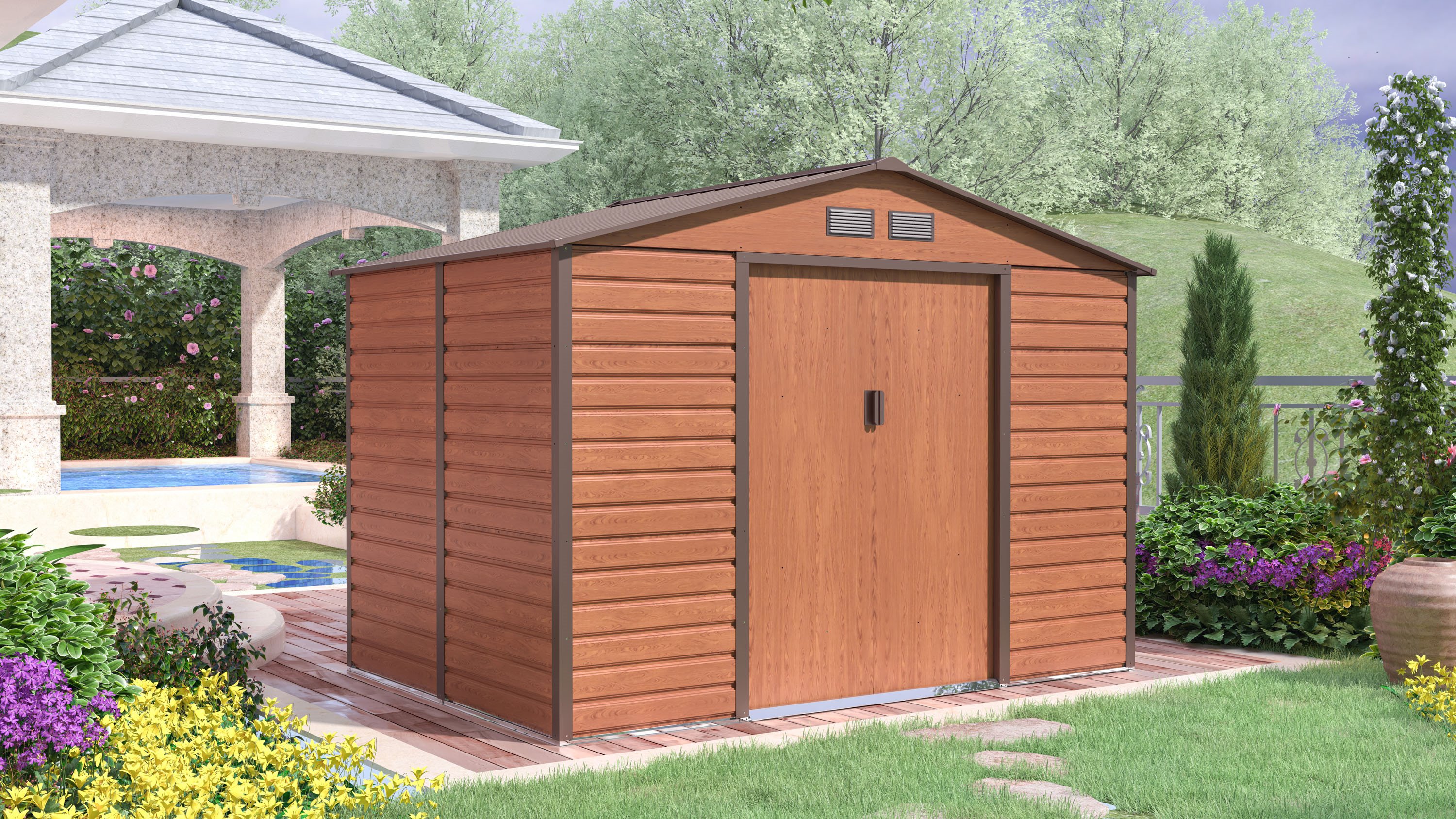 G21 GAH 529-277x191 cm kerti tároló barna 63900535 164 800 Ft / db [2 db 2%] [5 db 3%] [10 db 5%] Túlméretes áru, mindig számolunk szállítási költséget. Gyártó: G21 Cikkszám: S100_63900535 Vonalkód (EAN13): 8595627418250 Súly: 80,00 kg G21 GAH 529-277x191 cm kerti tároló barna 63900535 A termék leírása : A G21 GAH 529 kerti házikó ideális tárolási lehetőséget nyújt egész évben a szerszámoknak, bútoroknak, motorkerékpároknak, fűnyíróknak, bozótvágónak, kerékpároknak, a medence tartozékainak és sok más használati cikknek, amelyek nem férnek be a házba. A kerti házikó modern megjelenésben két nagy tolóajtóval rendelkezik, valamint magas bejárati kerettel, ami lehetővé teszi a kényelmes hozzáférést. A G21 kerti házikók összeszerelését minden körülmény között javasoljuk rögzített, például kövezett vagy betonozott teraszon, vagy előre elkészített felületen, például fapadlón, paneleken, stb. A G21 GAH 1085 kertiházikó minőségi profilozott acéllemezből készült, melynek vastagsága 0,25 – 0,30 mm. Ezenkívük horganyzott és porszórással bevont. A szerkezete szintén acél és horganyzott. Szellőző nyílásokkal is rendelkezik. A stabil horganyzott keretre kell erősíteni az acél, horganyzott porszórással bevont lécet, amely ellenáll az időjárás viszontagságainak. A házikó összeszerelése rendkívül egyszerű. A házikó tartozékai a fa kilincsek, amelyek lehetővé teszik a házikó bezárását. A kerti házikó fedele biztonságos akár 90 kg/ m2 maximális hóterhelésig. A fém kerti házikó szerszámokra modern külsővel rendelkezik és kiszállítása kartondobozban történik. Az elülső lap mérete 277 cm, magassága a legmagasabb ponton 198 cm és az oldalsó rész mérete 191 cm. A fal magassága tető nélkül 163 cm. Az elülső oldalán található az ajtó/bejárat. A fém felület fa mintázata igazán élethű, igy természetes hatást keltve nem zavarja a kert látképét. A G21 a fém háznál a hagyományos természetes dizájnt és a modern, kiváló minőségű anyagokat ötvözi. Ezért a ház sok éven át szépíteni fogja a kertjét, anélkül, hogy különösebb karbantartást igényelne. Műszaki adatok: Külső méretek: 277 x 198 x 191 cm Belső méretek: 267 x 193 x 181 cm Ajtó mérete: 117 x 160 cm Súly: cca 80 kg Szín: szürke Csomag mérete: 172 x 72 x 14 cm A csomag tartalma: G21 kerti házikó Használati szerelési útmutató magyar nyelven Mennyiség db Kosárba tesz