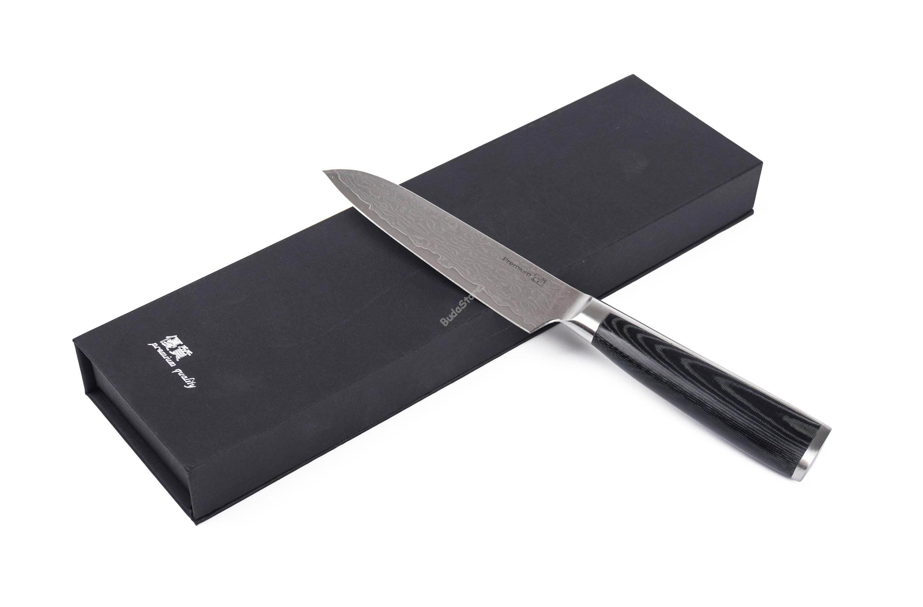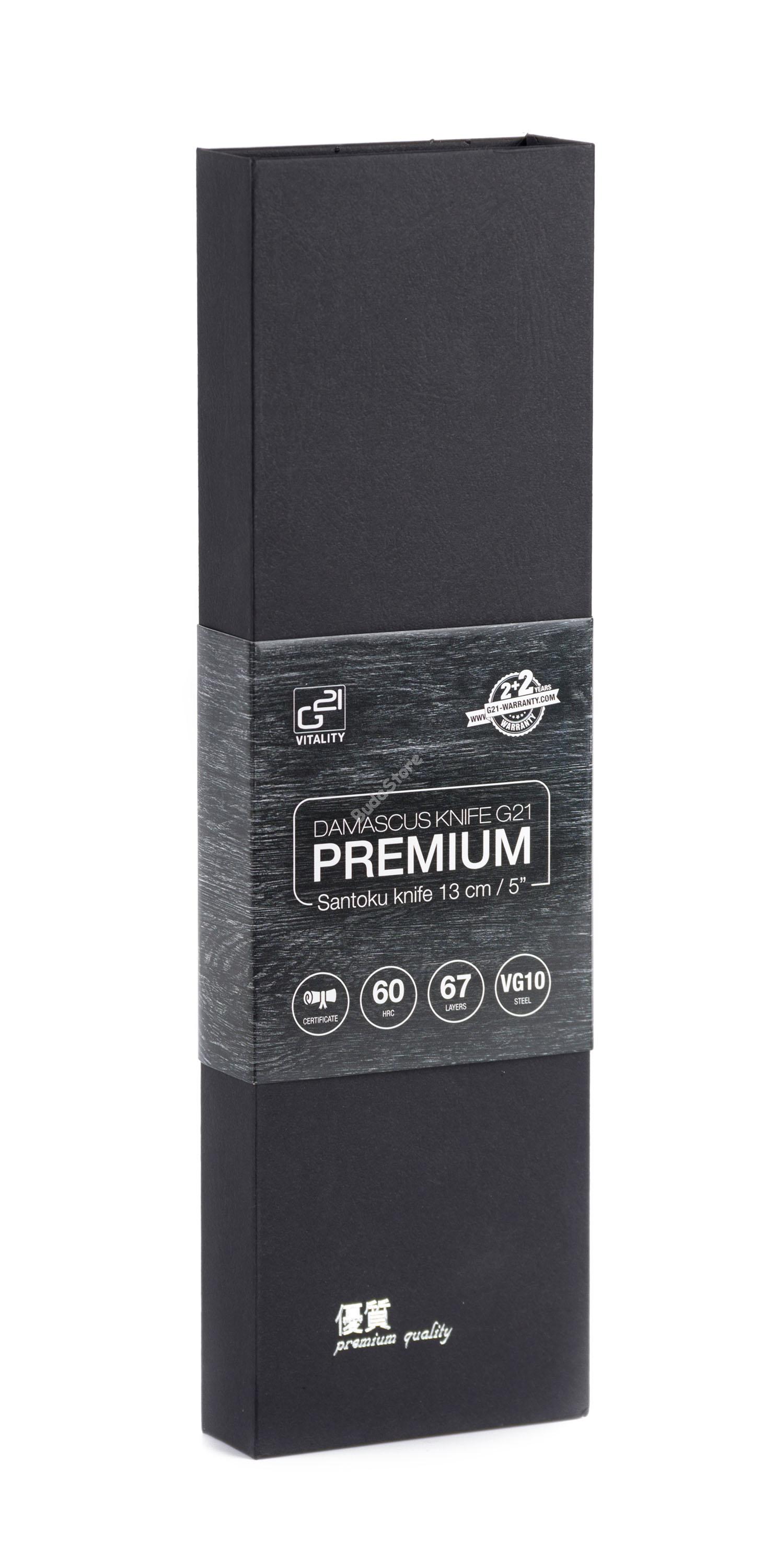 G21 Gourmet Damascus Santoku kés 13cm 6002297 16 690 Ft / db [2 db 2%] [5 db 3%] [10 db 5%] Gyártó: G21 Cikkszám: S100_6002297 Vonalkód (EAN13): 8595627422004 Súly: 1,00 kg G21 Gourmet Damascus Santoku kés 13cm 6002297 A minőséges G21 Gourmet Damascus Santoku 13 cm-es univerzális, damaszkuszi acélból készült kés tökéletesen fog szeletelni. A kés pengéje minőséges 67 rétegű damaszkuszi VG-10 acélból készült. A kés markolata extra erős anyagból készült, ún. Micrata. A termék leírása Kés damaszkuszi acélból a konyhában? Igen, ez a tökéletes választás. A damaszkuszi acél erősebb és tartósabb a sima acéllal szemben, ráadásul az egyedi acél mintának köszönhetően luxus kiegészítőjévé válik a konyhájának. A minőséges G21 Gourmet Damascus Santoku 13 cm-es univerzális, damaszkuszi acélból készült kés tökéletesen fog szeletelni, vágni. Az átlagos főzésből szórakozás válik, melyet minden szakács és haspók értékelni fog. Minőséges anyag és kialakítás A G21 Gourmet Damascus kés pengéje minőséges 67 rétegű damaszkuszi VG-10 acélból készült, mely rendkívül ellenálló, stabil és hihetetlenül hosszú élettartammal rendelkezik. A rétegezett damaszkuszi acélt fegyverkészítéshez is használták. A damaszkuszi acél kettő, vagy több különféle acél egyvelege, mely egy egészet alkot. Ezek eredménye egy nagyon erős, ellenálló, ráadásul törésmentes anyag. Ezen anyagnak köszönhetően a G21 Gourmet Damascus kés éles, ellenálló, tartós és megfelelő karbantartás mellett több évtizedig is jó szolgálatot tehet. A kés markolata extra erős és ellenállót laminált anyagból készült, ún. Micrata. A micrata egy rétegelt szerkezetű, műgyantával kiöntött alapanyag, melyben nem üvegszál, hanem természetes alapanyag biztosítja a rétegeket. Így készült ez az erős,kemény markolat, mely nem enged az idő múlásának. A kés sima, egyenes, tiszta kialakítása minden konyha díszévé válik. Meghosszabbított garancia 2+2 év A termék minőségét 4 évig garantáljuk. A + 2 év garanciális időszakért kérjük regisztráljon a http://g21-warranty.com oldalon. Használja ki ezt a lehetőséget és regisztráljon egyből vásárlás után. Paraméterek Márka: G21 Model: Gorumet Damascus Santoku 13 cm Meghatározás: konyhai kés Penge hossza: 13 cm Anyag: 67 rétegű damaszkuszi acél, VG-10 Keménysége: 60 HRC Markolat anyaga: Micrata 2+2 év garancia (a http://g21-warranty.com oldalon való regisztráció után) Csomagolás méretei: 30 x 4 x 9 cm A csomagolás súlya: 0,3 kg Certifikáció: LFGB Mennyiség db Kosárba tesz