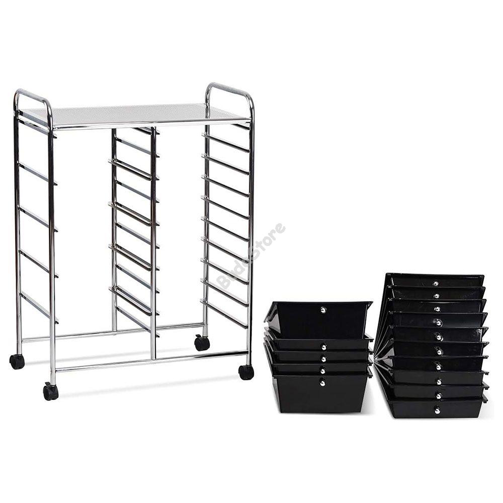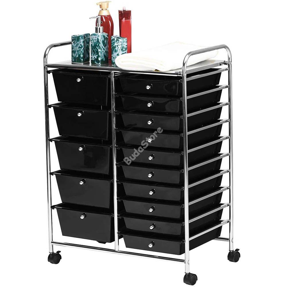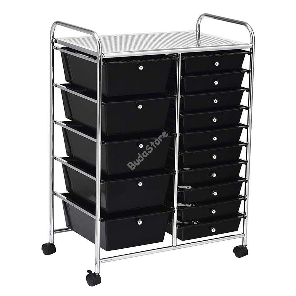 Irodákban, szépségszalonokban de az otthoni háztartásban egyaránt gyakori probléma, hogy nincs elegendő hely a kiegészítők és felszerelések tárolására. Erre jelent praktikus megoldást a 15 fiókos tároló kocsi, mely 5  nagyobb és 10 kisebb méretű fiókkal lett ellátva, így szortírozhatod holmidat és mindennek megtalálhatod a tökéletes helyet. Kerekekkel felszerelt, így megpakolt állapotban is könnyen mozgathatod. Krómozott vázának és letisztult stílusának köszönhetően bármely stílusú helyiségben elhelyezheted.