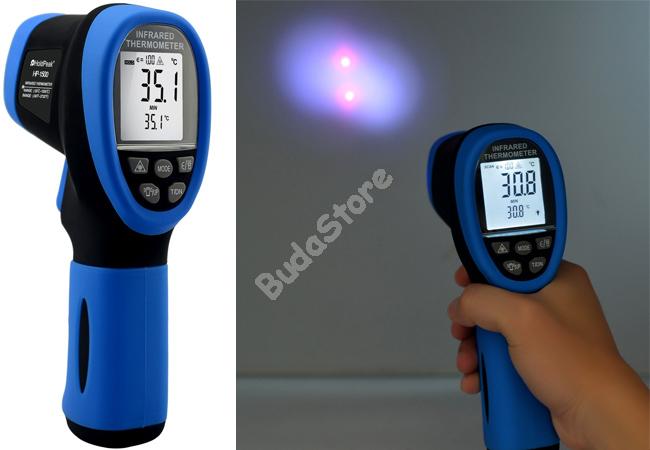 HOLDPEAK 1500 Infravörös hőmérsékletmérő 114491 52 760 Ft / db [2 db 2%] [5 db 3%] [10 db 5%] Gyártó: HOLDPEAK Cikkszám: S003_114491 Átvétel: Ez a termék boltunkban személyesen is átvehető. Infravörös hőmérsékletmérő, -50°C/+1500°C, kijelzés C°-ban és F°-ban. Az infravörös hőmérséklet érzékelés segítségével érintés nélkül mérhető meg szilárd vagy folyékony tárgyak hőmérséklete. A pisztoly szerű kialakítás lehetővé teszi, hogy pontosan az adott terület hőmérsékletét tudjuk megmérni. A mérési eredményeket a jól látható LCD kijelzőről olvashatja le. - Infravörös hőmérsékletérzékelő lencse. - Távolság/tárgy optikai tényező: 30:1. - LCD kijelző. - Háttérvilágítás. - Adattárolás, visszahívás funkció. - Minimális, maximális érték meghatározás. - Átlag és különbség számolás funkció. - Utolsó mért adat kijelzőn tartása. - Mérési válaszidő: 500msec. - Emisszió: 0.1-1.0 (állítható). - Mérési tartomány/pontosság: -50°C - 0°C / +/- 4°C,0°C - 1500°C /+/- 2°C. - Hőmérséklet kijelzés Celsius vagy Fahrenheit fokban. - Pisztoly alakú kiképzés. - Automata kikapcsolás. - Tápfeszültség: 9VDC 6F22 elemről. - Működési hőmérséklet: 0°C - +40°C. - Méretei: 175mm x 95mm x 65mm. - Súlya: 160g. - CE minősítés. Mennyiség db Kosárba tesz