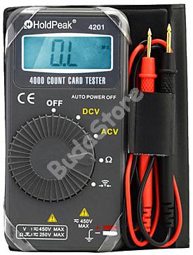 HOLDPEAK 4201 Digitális zseb multiméter 114867 9 600 Ft / db [2 db 2%] [5 db 3%] [10 db 5%] Gyártó: HOLDPEAK Cikkszám: S003_114867 Átvétel: Ez a termék boltunkban személyesen is átvehető. Digitális zseb multiméter, VDC, VAC, ellenállás, dióda. Alapvető elektromos mértékegységek mérésére alkalmas, digitális, LCD kijelzős multiméter. Egyenfeszültség, egyenáram, váltófeszültség, ellenállás mérésére alkalmas. További szolgáltatása dióda tesztelő és szakadásjelző funkció. Használata, elsősorban oktatási, hobbi és ellenőrzési célokra javasolt. Rendkívül kis méretének köszönhetően szinte bárhol elfér. - Digitális multiméter. - Automatikus méréshatár váltás. - 4 számjegyes LCD kijelző, 9mm-es karakterekkel. - Maximális értékkijelzés: 2999. - Polaritás független mérés (fordított polaritás esetén - kijelzése). - Alacsony elemfeszültség kijelzés. - Automatikus és manuális kikapcsolás. - VDC mérési tartomány/kijelzési felbontás/pontosság: - 400mV / 0.1mV / +/-1.3%. - 4V / 1mV / +/-1.3%. - 40V / 10mV / +/-1.3%. - 400V / 100mV / +/-1.3%. - 450V / 1V / +/-1.3%. - Bemeneti ellenállás VDC mérési módban: 10Mohm. - Túlfeszültség védelem. - VAC mérési tartomány/kijelzési felbontás/pontosság: - 4V / 1mV / +/-2.3%. - 40V / 10mV / +/-2.3%. - 400V / 100mV / +/-2.3%. - 450V / 1V / +/-2.3%. - Váltófeszültség frekvenciatartománya: 50Hz-400Hz. - Bemeneti ellenállás VAC mérési módban: 10Mohm. - Ellenállás mérési tartomány/kijelzési felbontás/pontosság: - 400ohm / 0.1ohm / +/-2%. - 4kohm / 1ohm / +/-2%. - 40kohm / 10ohm / +/-2%. - 400kohm / 100ohm / +/-2%. - 4Mohm / 1kohm / +/-6%. - 40Mohm / 10kohm / +/-10%. - Dióda teszt, 1mV felbontásban. - Szakadásvizsgálat, hangjelzéssel. - Mérőzsinór. - Tápfeszültség: 2.4VDC 2 db LR-44 elemről. - Működési hőmérséklet: 0°C-40°C. - Működési páratartalom: maximum 80%. - CE minősítés. - Súlya: 110g (elemmel). - Mértei: 108mm x 54mm x 12mm. Mennyiség db Kosárba tesz
