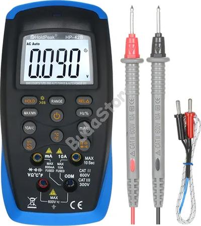 HOLDPEAK 42B Digitális multiméter 122545 14 760 Ft / db [2 db 2%] [5 db 3%] [10 db 5%] Gyártó: HOLDPEAK Cikkszám: S003_122545 Átvétel: Ez a termék boltunkban személyesen is átvehető. Digitális multiméter, VAC, VDC, áramerősség, dióda, ellenállás, hőmérséklet, LCD. - Digitális multiméter. - Mért értékek: AC/DC feszültség, áramerősség, dióda, ellenállás, akkumulátor teszt, hőmérséklet. - Feszültségmérés tartománya: 0 mV - 600 V. - Áramerősség mérés tartománya: 0 mA - 10 A. - NCV érzékelés. - LED és hangjelzés. - Maximum/minimum értékek beállítása. - Adattartás. - Nagyméretű LCD kijelző. - Akkumulátor tesztelő funkció. - Hőmérséklet kijelzése Celsius és Fahrenheit fokban. - Működési hőmérséklet: 0C - +40C. - Működési páratartalom: 0% - 85%. - Tápellátás: 2 x 1,5 VDC AAA elem (nem tartozék). - Méretek: 150 x 76 x 33 mm. - Tömeg: 220 g. - CE minősítés. Mennyiség db Kosárba tesz