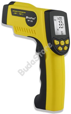 HOLDPEAK 720 Infravörös hőmérsékletmérő 113280 25 790 Ft / db [2 db 2%] [5 db 3%] [10 db 5%] Gyártó: HOLDPEAK Cikkszám: S003_113280 Átvétel: Ez a termék boltunkban személyesen is átvehető. Infravörös hőmérsékletmérő, -50°C/+720°C, kijelzés C°-ban és F°-ban. Az infravörös hőmérséklet érzékelés segítségével érintés nélkül mérhető meg szilárd vagy folyékony tárgyak hőmérséklete. A pisztoly szerű kialakítás lehetővé teszi, hogy pontosan az adott terület hőmérsékletét tudjuk megmérni. A mérési eredményeket a jól látható LCD kijelzőről olvashatja le. - Infravörös hőmérsékletérzékelő lencse. - Távolság/tárgy optikai tényező: 16:1. - LCD kijelző. - Adattárolás, visszahívás funkció. - Minimális, maximális érték meghatározás. - Átlag és különbség számolás funkció. - Utolsó mért adat kijelzőn tartása. - Emisszió: 0.1-1.0 (állítható). - Mérési tartomány/pontosság: -50°C-720°C / +/-2% vagy +/-2%C. - Hőmérséklet kijelzés Celsius vagy Fahrenheit fokban. - Pisztoly alakú kiképzés. - Tápfeszültség: 9VDC 6F22 elemről. - Működési hőmérséklet: 0°C - +40°C. - Működési páratartalom: 10%-95% (nem kicsapódó). - Méretei: 146mm x 80mm x 38mm. - Súlya: 130g. - CE minősítés. Mennyiség db Kosárba tesz