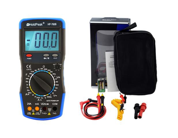 HOLDPEAK 760 B Digitális multiméter 760B 20 580 Ft / db [2 db 2%] [5 db 3%] [10 db 5%] Gyártó: HOLDPEAK Cikkszám: S003_110677 Súly: 0,32 kg Átvétel: Ez a termék boltunkban személyesen is átvehető. HOLDPEAK 760 B digitális multiméter 760BUniverzális, digitális mérőműszer. A méréshatárok manuálisan állíthatók be. A nagy LCD kijelzőről könnyen leolvashatók a mért adatok. Egyenfeszültség, egyenáram, váltófeszültség, váltóáram, ellenállás, kapacitás, frekvencia és hőmérséklet mérésére is alkalmas. További szolgáltatása a tranzisztor és dióda tesztelő funkció, valamint a szakadásvizsgálat. Az adott elektronikai jellemző mérési tartományában a nem használható mérővezeték csatlakozási pontjai lezáródnak, így elkerülhető a téves csatlakoztatás.- Univerzális, digitális multiméter.- Manuális méréshatár váltás.- 3.1/2 számjegyes LCD kijelző, 27 mm karaktermagasság.- Háttérvilágítás.- Maximális értékkijelzés: 1999.- Méréshatár kijelzés.- Utolsó mért adat tárolása funkció.- Automatikus negatív polaritás kijelzés.- Készülék automatikus kikapcsolása.- Alacsony elemfeszültség kijelzés.- VDC mérési tartomány/kijelzési felbontás/pontosság:- 200mV/100umV/+/-0.5%.- 2V/1mV/+/-0.5%.- 20V/10mV/+/-0.5%.- 200V/100mV/+/-0.5%.- 1000V/1V/+/-1.5%.- Bemeneti ellenállás VDC mérési módban: 10Mohm.- Túlfeszültség védelem.- VAC mérési tartomány/kijelzési felbontás/pontosság:- 2V/1mV/+/-1.5%.- 20V/10mV/+/-1.5%.- 200V/100mV/+/-1.5%.- 700V/1V/+/-2.5%.- Váltófeszültség frekvenciatartománya: 40Hz-200Hz.- ADC mérési tartomány/kijelzési felbontás/pontosság:- 2mA/1uA/+/-0.8%.- 20mA/10uA/+/-0.8%.- 200mA/100uA/+/-1.2%.- 20A/10mA/+/-2%.- AAC mérési tartomány/kijelzési felbontás/pontosság:- 2mA/1uA/+/-1%.- 200mA/100uA/+/-2%.- 20A/10mA/+/-3%.- Váltóáram frekvenciatartománya: 40Hz-200Hz.- Túláramvédelem belső 200mA olvadó biztosítékkal (2mA-200mA), 20A olvadó biztosítékkal (20A).- Ellenállás mérési tartomány/kijelzési felbontás/pontosság:- 200ohm/0.1ohm/+/-1.2%.- 2kohm/1ohm/+/-0.8%.- 20kohm/10ohm/+/-0.8%.- 200kohm/100ohm/+/-0.8%.- 2Mohm/1kohm/+/-0.8%.- 20Mohm/10kohm/+/-2.5%.- 200Mohm/100kohm/+/-5%.- Kapacitás mérési tartomány/kijelzési felbontás/pontosság:- 2nF/1pF/+/-2.5%.- 20nF/10pF/+/-2.5%.- 200nF/100pF/+/-2.5%.- 2uF/1nF/+/-2.5%.- 20uF/10nF/+/-2.5%.- Frekvencia mérési tartomány/kijelzési felbontás/pontosság:- 200kHz/100Hz/+/-3%.- Hőmérséklet mérési tartomány/kijelzési felbontás/pontosság:- -20°C - +150°C/1°C/+/-3C.- 150°C-300°C/1°C/+/-3%.- 300°C-1000°C/1°C/+/-3.5%.- Tranzisztor hFE tesztelés.- NPN és PNP tranzisztorok mérése.- hFE tartomány: 0-1000.- Dióda teszt, 1mV felbontásban.- Szakadásvizsgálat, hangjelzéssel.- Tesztelési feszültség /áram: Ib=10uA/Vce=3V.- Fekete, szövet hord táska.- Mérőzsinór.- Hőmérsékletmérő szonda.- Tápfeszültség: 9VDC 6F22 elemről.- Működési hőmérséklet: 0°C-40°C.- Működési páratartalom: maximum 75%.- Méretei: 195 mm x 89 mm x 40 mm.- Tömega: 320g (elemmel).- CE minősítés. Mennyiség db Kosárba tesz