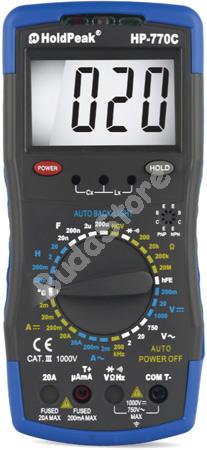 HOLDPEAK 770C Digitális multiméter 113757 31 550 Ft / db [2 db 2%] [5 db 3%] [10 db 5%] Gyártó: HOLDPEAK Cikkszám: S003_113757 Súly: 0,50 kg Átvétel: Ez a termék boltunkban személyesen is átvehető. Digitális multiméter, VAC,VDC,AAC,ADC,ellenállás,kapacitás,induktivitás,feszültség kereső. Univerzális, digitális mérőműszer. A méréshatárok manuálisan állíthatók be. A nagy LCD kijelzőről könnyen leolvashatók a mért adatok. Egyenfeszültség, egyenáram, váltófeszültség, váltóáram, ellenállás, kapacitás, frekvencia, induktivitás és hőmérséklet mérésére is alkalmas. További szolgáltatása a tranzisztor és dióda tesztelő funkció, a szakadásvizsgálat és az érintés nélküli váltófeszültség keresés. Az adott elektronikai jellemző mérési tartományában a nem használható mérővezeték csatlakozási pontjai lezáródnak, így elkerülhető a téves csatlakoztatás. - Univerzális, digitális multiméter. - Manuális méréshatár váltás. - Aktuális méréshatár megvilágítása. - 3.1/2 számjegyes LCD kijelző, 27mm karaktermagasság. - Háttérvilágítás. - Maximális értékkijelzés: 1999. - Méréshatár kijelzés. - Utolsó mért adat tárolása funkció. - Automatikus negatív polaritás kijelzés. - Készülék automatikus kikapcsolása. - Alacsony elemfeszültség kijelzés. - CAT III 1000V. - VDC mérési tartomány/kijelzési felbontás/pontosság: - 200mV / 0.1mV / +/-0.5%. - 20V / 10mV / +/-0.5%. - 1000V / 1V / +/-0.8%. - Bemeneti ellenállás VDC mérési módban: 10Mohm. - Túlfeszültség védelem. - VAC mérési tartomány/kijelzési felbontás/pontosság: - 2V / 1mV / +/-1.0%. - 20V / 10mV / +/-1.0%. - 750V / 1V / +/-1.2%. - Váltófeszültség frekvenciatartománya: 40Hz – 400Hz. - ADC mérési tartomány/kijelzési felbontás/pontosság: - 2mA / 1uA / +/-1.2%. - 20mA / 10uA / +/-1.2%. - 200mA / 100uA / +/-1.2%. - 20A / 10mA / +/-2%. - AAC mérési tartomány/kijelzési felbontás/pontosság: - 2mA / 1uA / +/-1.5%. - 200mA / 100uA / +/-1.5%. - 20A / 10mA / +/-2.5%. - Váltóáram frekvenciatartománya: 40Hz - 400Hz. - Túláramvédelem belső 200mA olvadó biztosítékkal (2mA-200mA), 20A olvadó biztosítékkal (20A). - Ellenállás mérési tartomány/kijelzési felbontás/pontosság: - 200ohm / 0.1ohm / +/-1.0%. - 20kohm / 10ohm / +/-1.0%. - 200kohm / 100ohm / +/-1.0%. - 20Mohm / 10kohm / +/-1.5%. - Kapacitás mérési tartomány/kijelzési felbontás/pontosság: - 20nF / 10pF / +/-2.5%. - 200nF / 100pF / +/-2.5%. - 2uF / 1nF / +/-2.5%. - 200uF / 10nF / +/-5.0%. - Induktivitás mérési tartomány/kijelzési felbontás/pontosság: - 20mH / 10uH / +/-2.5%. - 200mH / 10uH / +/-2.5%. - 2H / 1mH / +/-2.5%. - 20H / 10mH / +/-2.5%. - Frekvencia mérési tartomány/kijelzési felbontás/pontosság: - 200kHz / 100Hz / +/-3%. - Hőmérséklet mérési tartomány/kijelzési felbontás/pontosság: - -20°C - +150°C / 1°C / +/-3C. - 150°C-1000°C / 1°C / +/-3%. - Tranzisztor hFE tesztelés. - NPN és PNP tranzisztorok mérése. - hFE tartomány: 0-1000. - Dióda teszt, 1mV felbontásban. - Szakadásvizsgálat, hangjelzéssel. - Tesztelési feszültség /áram: Ib=10uA/Vce=3V. - Érintés nélküli váltófeszültség érzékelés. - Érzékelési tartomány: 90 VAC – 1000 VAC rms. - Érzékelés jelzése LED-del és hangjelzéssel. - Fekete, szövet hord táska. - Mérőzsinór. - Hőmérsékletmérő szonda. - Tápfeszültség: 9VDC 6F22 elemről. - Működési hőmérséklet: 0°C - 40°C. - Működési páratartalom: maximum 75%. - Méretek: 195 mm x 88 mm x 40 mm. - Súlya: 320 g (elemmel). - CE minősítés. Mennyiség db Nem rendelhető