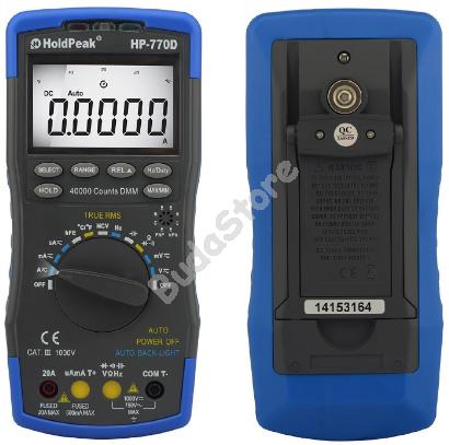 HOLDPEAK 770D Digitális multiméter 114781 49 220 Ft / db [2 db 2%] [5 db 3%] [10 db 5%] Gyártó: HOLDPEAK Cikkszám: S003_114781 Átvétel: Ez a termék boltunkban személyesen is átvehető. HOLDPEAK 770D Digitális multiméter 114781 Digitális multiméter,VAC,VDC,AAC,ADC,ellenállás,kap.,frek.,akt. cikl.,hőm.,hFE,NCV,dióda. Laborszintű, mindig pontos, valós effektív értékek mérésére alkalmas, univerzális, digitális mérőműszer. A méréshatárok automatikusan beállítódnak. A nagy LCD kijelzőről könnyen leolvashatók a mért adatok. Egyenfeszültség, egyenáram, váltófeszültség, váltóáram, frekvencia, aktív ciklusidő, hőmérséklet, ellenállás és kapacitás mérésére is alkalmas. További szolgáltatása a tranzisztor és dióda tesztelő funkció, a szakadásvizsgálat és az érintés nélküli váltófeszültség keresés. Az adott elektronikai jellemző mérési tartományában a nem használható mérővezeték csatlakozási pontjai lezáródnak, így elkerülhető a téves csatlakoztatás. - Nagy pontosságú, valós effektív értékeket mérő (True RMS), digitális multiméter. - Automatikus méréshatár váltás. - Aktuális mérés megvilágítása. - 4 1/2 számjegyes LCD kijelző, bekapcsolható háttérvilágítással. - Méréshatár kijelzés. - Minimális és maximális értékhatár megadása. - Referencia érték mérése. - Utolsó mért adat tárolása funkció. - Automatikus negatív polaritás kijelzés. - Készülék automatikus kikapcsolása. - Alacsony elemfeszültség kijelzés. - CAT III 1000V. - VDC mérési tartomány/kijelzési felbontás/pontosság: - 40mV / 1uV / +/-0.1%. - 400mV / 10uV / +/-0.1%. - 4V / 100uV / +/-0.1%. - 40V / 1mV / +/-0.1%. - 400V / 10mV / +/-0.1%. - 1000V / 100mV / +/-0.1%. - Bemeneti ellenállás VDC mérési módban: 10Mohm. - Túlfeszültség védelem. - VAC mérési tartomány/kijelzési felbontás/pontosság: - 40mV / 1uV / +/-1%. - 400mV / 10uV / +/-0.8%. - 4V / 100uV / +/-0.8%. - 40V / 1mV / +/-0.8%. - 400V / 10mV / +/-0.8%. - 750V / 100mV / +/-1.2%. - Bemeneti impedancia VAC mérési módban: 10Mohm. - Váltófeszültség frekvenciatartománya: 40Hz - 1kHz. - ADC mérési tartomány/kijelzési felbontás/pontosság: - 400uA / 0.01uA / +/-1%. - 4000uA / 0.1uA / +/-1%. - 40mA / 1uA / +/-1% - 400mA / 10uA / +/-1% - 4A / 100uA / +/-1.2%. - 20A / 1mA / +/-1.2%. - AAC mérési tartomány/kijelzési felbontás/pontosság: - 400uA / 0.01uA / +/-1.2%. - 4000uA / 0.1uA / +/-1.2%. - 40mA / 1uA / +/-1.2% - 400mA / 10uA / +/-1.2% - 4A / 100uA / +/-1.5%. - 20A / 1mA / +/-1.5%. - Túláramvédelem belső 500mA olvadó biztosítékkal. - Váltóáram frekvenciatartománya: 40Hz-400Hz. - Frekvencia mérési tartomány/kijelzési felbontás/pontosság: - 9.999Hz / 0.001Hz / +/-0.1%. - 99.99Hz / 0.01Hz / +/-0.1%. - 999.9Hz / 0.1Hz / +/-0.1%. - 9.999kHz / 1Hz / +/-0.1%. - 99.99kHz / 10Hz / +/-0.1%. - Érzékenység: szinusz hullám esetén 0.6V rms (9.999MHz-nél: 1.5V rms). - Kapacitás mérési tartomány/kijelzési felbontás/pontosság: - 9.999nF / 1pF / +/-5%. - 99.99nF / 10pF / +/-3%. - 999.9nF / 100pF / +/-2.5%. - 9.999uF / 1nF / +/-2.5%. - 99.99uF / 10nF / +/-5%. - 999.9uF / 100nF / +/-10%. - 9.999mF / 1uF / +/-10%. - 99.99mF / 10uf / +/-10%. - Túlfeszültség védelem: 500V DC vagy AC rms. - Aktív ciklusidő mérési tartomány: - 0.1% - 99.9% / 2%, 10Khz-nél alacsonyabb frekvencián. - Érzékenység: szinusz hullám esetén 0.6V rms. - Túlfeszültség védelem: 500V DC vagy AC rms. - Hőmérséklet mérési tartomány/kijelzési felbontás/pontosság: - -20°C - +150°C / 0.1°C / +/-3°C. - +150°C - +1000°C / 0.1°C / +/-3%. - -4°F - +302°F / 0.1°F / +/-5°F. - +302°F - +1832°F / 0.1°F / +/-3%. - NiCr-NiSi mérőszonda. - Tranzisztor hFE tesztelés. - hFE tartomány: 0-1000. - Tesztelési feszültség /áram: Ib=10uA/Vce=1.8V. - Érintés nélküli váltófeszültség érzékelés. - Érzékelési tartomány: 90VAC - 1000VAC rms. - Érzékelés jelzése LED-del és hangjelzéssel. - NPN és PNP tranzisztorok mérése. - Dióda teszt. - Szakadásvizsgálat, hangjelzéssel. - Fekete, szövet hord táska. - Mérőzsinór. - Hőmérsékletmérő szonda. - Működési hőmérséklet: 0°C-40°C. - Működési páratartalom: maximum 75%. - Méretei: 195 mm x 88 mm x 40 mm. - Súlya: 350 g (elemmel). - CE minősítés. Mennyiség db Nem rendelhető