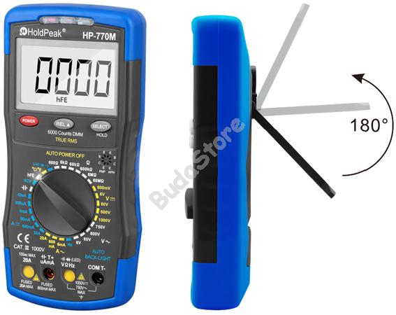 HOLDPEAK 770M Digitális multiméter 118270 17 640 Ft / db [2 db 2%] [5 db 3%] [10 db 5%] Gyártó: HOLDPEAK Cikkszám: S003_118270 Súly: 0,50 kg Átvétel: Ez a termék boltunkban személyesen is átvehető. Digitális multiméter,VAC,VDC,AAC,ADC,ellenállás, kap., frek., hőmérs., fesz. kereső, TRMS. Laborszintű, mindig pontos, valós effektív értékek mérésére alkalmas, univerzális, digitális mérőműszer. A méréshatárok automatikusra vagy manuálisra is beállíthatók. A nagy LCD kijelzőről könnyen leolvashatók a mért adatok. Egyenfeszültség, egyenáram, váltófeszültség, váltóáram, frekvencia, hőmérséklet, ellenállás és kapacitás mérésére is alkalmas. További szolgáltatása a tranzisztor és dióda tesztelő funkció, a szakadásvizsgálat és az érintés nélküli váltófeszültség keresés. Az adott elektronikai jellemző mérési tartományában a nem használható mérővezeték csatlakozási pontjai lezáródnak, így elkerülhető a téves csatlakoztatás. - Nagy pontosságú, valós effektív értékeket mérő (True RMS), digitális multiméter. - Automatikus és manuális méréshatár váltás. - Aktuális méréshatár megvilágítása. - 4 számjegyes LCD kijelző, automatikus háttérvilágítással. - Maximális értékkijelzés: 6000. - Méréshatár kijelzés. - Minimális és maximális értékhatár megadása. - Referencia érték mérése. - Automatikus negatív polaritás kijelzés. - Készülék automatikus kikapcsolása. - Alacsony elemfeszültség kijelzés. - Mechanikusan megakadályozza a mérőzsinór rossz helyre dugását. - VDC mérési tartomány/kijelzési felbontás/pontosság: - 600mV / 0.1mV / +/-0.5%. - 6V / 1mV / +/-0.5%. - 60V / 10mV / +/-0.5%. - 600V / 100mV / +/-0.5%. - 1000V / 1V / +/-0.5%. - VAC mérési tartomány/kijelzési felbontás/pontosság (TRMS). - 6V / 1mV / +/-1%. - 60V / 10mV / +/-1%. - 600V / 100mV / +/-1%. - 750V / 1V / +/-1.5%. - Váltófeszültség frekvenciatartománya: 40Hz - 400Hz. - ADC mérési tartomány/kijelzési felbontás/pontosság: - 60uA / 0.1uA / +/-1.5%. - 600uA / 0.1uA / +/-1.5%. - 6mA / 1uA / +/-1.5%. - 60mA / 10uA / +/-1.5%. - 600mA / 100uA / +/-1.5%. - 20A / 10mA / +/-2.5%. - AAC mérési tartomány/kijelzési felbontás/pontosság (TRMS): - 6mA / 10uA / +/-1.5%. - 600mA / 100uA / +/-2.5%. - Túláramvédelem belső 800mA olvadó biztosítékkal (600uA-600mA), 20A olvadó biztosítékkal (6A-20A). - Ellenállás mérési tartomány/kijelzési felbontás/pontosság: - 600ohm / 0.1ohm / +/-1%. - 6Kohm / 1ohm / +/-1%. - 600Kohm / 100ohm / +/-1%. - 6Mohm / 1Kohm / +/-1%. - 60Mohm / 10Kohm / +/-1.5%. - Kapacitás mérési tartomány/kijelzési felbontás/pontosság: - 9.999nF / 1pF / +/-3%. - 99.99nF / 10pF / +/-2.5%. - 999.9nF / 100pF / +/-2.5%. - 9.999uF / 1nF / +/-2.5%. - 99.99uF / 10nF / +/-5%. - 999.9uF / 100nF / +/-10%. - 9.999mF / 1uF / +/-10%. - 99.99mF / 10uf / +/-10%. - Frekvencia mérési tartomány/kijelzési felbontás/pontosság: - 9.999Hz / 0.001Hz / +/-0.1%. - 99.99Hz / 0.01Hz / +/-0.1%. - 999.9Hz / 0.1Hz / +/-0.1%. - 9.999kHz / 1Hz / +/-0.1%. - 99.99kHz / 10Hz / +/-0.1%. - 999.9kHz / 100Hz / +/-0.1%. - 9.999MHz / 1kHz / +/-0.1%. - Hőmérséklet mérési tartomány/kijelzési felbontás/pontosság: - -20°C - +150°C / 1°C / +/-3C. - 150°C-1000°C / 1°C / +/-3%. - Hőmérséklet-váltás Celsius és Fahrenheit között. - Tranzisztor hFE tesztelés. - NPN és PNP tranzisztorok mérése. - hFE tartomány: 0-1000. - Dióda teszt, 1mV felbontásban. - Szakadásvizsgálat, hangjelzéssel. - Tesztelési feszültség /áram: Ib=10uA/Vce=1.8V. - Érintés nélküli váltófeszültség érzékelés. - Érzékelési tartomány: 90 VAC - 1000 VAC rms. - Érzékelés jelzése LED-del és hangjelzéssel. - Fekete, szövet hord táska. - Mérőzsinór. - Hőmérsékletmérő szonda. - Tápfeszültség: 9VDC 6F22 elemről. - Működési hőmérséklet: 0°C-40°C. - Működési páratartalom: maximum 75%. - Méretei: 195mm x 88mm x 40mm. - Súlya: 350g (elemmel). - CE minősítés. Mennyiség db Kosárba tesz
