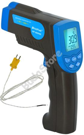 HOLDPEAK 880NK Infravörös hőmérsékletmérő 114816 19 170 Ft / db [2 db 2%] [5 db 3%] [10 db 5%] Gyártó: HOLDPEAK Cikkszám: S003_114816 Átvétel: Ez a termék boltunkban személyesen is átvehető. Infravörös hőmérsékletmérő, külső mérőszonda, -30°C/+550°C, LCD kijelző,C° és F° kijelzés. Az infravörös hőmérséklet érzékelés segítségével érintés nélkül mérhető meg szilárd vagy folyékony tárgyak hőmérséklete. A pisztoly szerű kialakítás lehetővé teszi, hogy pontosan az adott terület hőmérsékletét tudjuk megmérni. A külső szonda bemenetre csatlakoztatott érzékelővel közvetlenül a felületen is megmérhető a hőmérséklet. A mérési eredményeket a jól látható LCD kijelzőről olvashatja le. - Infravörös hőmérsékletérzékelő lencse. - Külső NTC érzékelő bemenet. - Külső érzékelővel a mérhető maximális hőmérséklet 550°C lehet. - LCD kijelző. - Lézeres célzó. - Háttérvilágítás. - Mérési válaszidő: 500msec. - Emisszió: 0.1 - 1.0 (állítható). - Mérési tartomány/pontosság: - -30°C-550°C / +/-2%. - Minimum, maximum, átlagértékek kijelzése. - Hőmérséklet kijelzés Celsius vagy Fahrenheit fokban. - Külső mérőszonda. - Pisztoly alakú kiképzés. - Automata kikapcsolás. - Adat rögzítés a kijelzőn. - Tápfeszültség: 9VDC 6F22 elemről vagy akkumulátorról. - Működési hőmérséklet: 0°C - +40°C. - Működési páratartalom: 10%-95% (nem kicsapódó). - Méretei: 146mm x 80mm x 38mm. - Súlya: 130g. - CE minősítés. Mennyiség db Kosárba tesz