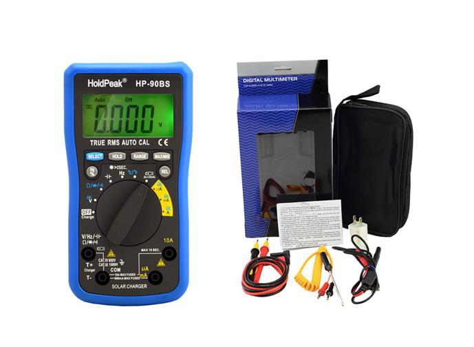 HOLDPEAK 90 BS Digitális multiméter 90BS 29 800 Ft / db [2 db 2%] [5 db 3%] [10 db 5%] Gyártó: HOLDPEAK Cikkszám: S003_110629 Súly: 0,32 kg Átvétel: Ez a termék boltunkban személyesen is átvehető. HOLDPEAK 90 BS digitális multiméter 90BSLaborszintű, mindig pontos, valós effektív értékek mérésére alkalmas, univerzális, digitális mérőműszer. A méréshatárok automatikusra vagy manuálisra is beállíthatók. A nagy LCD kijelzőről könnyen leolvashatók a mért adatok. Egyenfeszültség, egyenáram, váltófeszültség, váltóáram, frekvencia, hőmérséklet, ellenállás és kapacitás mérésére is alkalmas. További szolgáltatása a dióda tesztelő funkció, valamint a szakadásvizsgálat. A készülék napelemes kivitelű, a belső akkumulátora külső áramforrásról is tölthető.- Nagy pontosságú, valós effektív értékeket mérő (True RMS), digitális multiméter.- Beépített, napelemes akkumulátortöltő áramkör.- Automatikus és manuális méréshatár váltás.- 4 számjegyes LCD kijelző, bekapcsolható háttérvilágítással.- 22 mm-es karaktermagasság.- Maximális értékkijelzés: 6000.- Méréshatár kijelzés.- Minimális és maximális értékhatár megadása.- Referencia érték mérése.- Utolsó mért adat tárolása funkció.- Automatikus negatív polaritás kijelzés.- Készülék automatikus kikapcsolása.- Alacsony elemfeszültség kijelzés.- VDC mérési tartomány/kijelzési felbontás/pontosság:- 600mV/0.1mV/+/-1.2%.- 6V/1mV/+/-0.8%.- 60V/10mV/+/-0.8%.- 600V/100mV/+/-0.8%.- 1000V/1V/+/-1.5%.- Bemeneti ellenállás VDC mérési módban: 1Mohm (600mV tartományban: 100Mohm).- Túlfeszültség védelem.- VAC mérési tartomány/kijelzési felbontás/pontosság:- 600mV/0.1mV/+/-2.5%.- 6V/1mV/+/-1%.- 60V/10mV/+/-1%.- 600V/100mV/+/-1%.- 750V/1V/+/-1%.- Váltófeszültség frekvenciatartománya: 40Hz-1KHz (600mV), 40Hz-400Hz (6V-750V).- ADC mérési tartomány/kijelzési felbontás/pontosság:- 600uA/0.1uA/+/-1%.- 6000uA/1uA/+/-1%.- 60mA/10uA/+/-1%.- 600mA/100uA/+/-1%.- 6A/1mA/+/-1.5%.- 10A/10mA/+/-1.5%.- AAC mérési tartomány/kijelzési felbontás/pontosság:- 600uA/0.1uA/+/-1.5%.- 6000uA/1uA/+/-1.5%.- 60mA/10uA/+/-1.5%.- 600mA/100uA/+/-1.5%.- 6A/1mA/+/-2%.- 10A/10mA/+/-2%.- Túláramvédelem belső 850mA olvadó biztosítékkal (600uA-600mA), 10A olvadó biztosítékkal (6A-10A).- Ellenállás mérési tartomány/kijelzési felbontás/pontosság:- 600ohm/0.1ohm/+/-1.2%.- 6Kohm/1ohm/+/-1.2%.- 60Kohm/10ohm/+/-1.2%.- 600Kohm/100ohm/+/-1.2%.- 6Mohm/1Kohm/+/-1.5%.- 60Mohm/10Kohm/+/-2.5%.- Kapacitás mérési tartomány/kijelzési felbontás/pontosság:- 9.999nF/0.001nF/+/-3%.- 99.99nF/1pF/+/-2.5%.- 999.9nF/0.1nF/+/-2.5%.- 9.999uF/1nF/+/-2.5%.- 99.99uF/10nF/+/-3%.- 999.9uF/0.1uF/+/-3%.- 9.999mF/1uF/+/-3.5%.- 99.99mF/10uf/+/-3.5%.- Frekvencia mérési tartomány/kijelzési felbontás/pontosság:- 9.999Hz/0.001Hz/+/-0.5%.- 99.99Hz/0.01Hz/+/-0.5%.- 999.9Hz/0.1Hz/+/-0.5%.- 9.999kHz/1Hz/+/-0.5%.- 99.99kHz/10Hz/+/-0.5%.- 999.9kHz/100Hz/+/-0.5%.- 9.999MHz/1KHz/+/-0.5%.- Működési periódus mérési tartomány/pontosság:- 1%-99%/+/-0.5%.- Hőmérséklet mérési tartomány/kijelzési felbontás/pontosság:- 4°F - 1832°F/1°F/+/-3%.- -20°C - 1000°C/1°C/+/-3%.- Dióda teszt, 1mV felbontásban.- Szakadásvizsgálat, hangjelzéssel.- Kihajtható támasztó konzol.- Fekete, szövet hord táska.- Mérőzsinór.- Hőmérsékletmérő szonda.- Szigetelt krokodilcsipesz pár.- USB-s akkumulátortöltő kábel.- Tápfeszültség: 3.6VDC, beépített akkumulátorról.- Működési hőmérséklet: 0°C-40°C.- Működési páratartalom: maximum 85%.- Méretei: 193 mm x 89 mm x 41 mm.- Tömega: 320g (elemmel).- CE minősítés. Mennyiség db Kosárba tesz