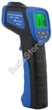 HOLDPEAK 981C Infravörös hőmérsékletmérő 114488 11 310 Ft / db [2 db 2%] [5 db 3%] [10 db 5%] Gyártó: HOLDPEAK Cikkszám: S003_114488 Átvétel: Ez a termék boltunkban személyesen is átvehető. HOLDPEAK 981C Infravörös hőmérsékletmérő 114488 Infravörös hőmérsékletmérő, -30°C/+550°C, kijelzés C°-ban és F°-ban, lézer. Az infravörös hőmérséklet érzékelés segítségével érintés nélkül mérhető meg szilárd vagy folyékony tárgyak hőmérséklete. A pisztoly szerű kialakítás lehetővé teszi, hogy pontosan az adott terület hőmérsékletét tudjuk megmérni. A mérési eredményeket a jól látható LCD kijelzőről olvashatja le. - Infravörös hőmérsékletérzékelő lencse. - Távolság/tárgy optikai tényező: 8:1. - LCD kijelző. - Adattárolás, visszahívás funkció. - Minimális, maximális érték meghatározás. - Átlag és különbség számolás funkció. - Utolsó mért adat kijelzőn tartása. - Mérési válaszidő: 500msec. - Emisszió: 0.95 - Mérési tartomány/pontosság: -30°C-550°C / +/-2% vagy +/-2%C. - Hőmérséklet kijelzés Celsius vagy Fahrenheit fokban. - Pisztoly alakú kiképzés. - Ki-/bekapcsolható, lézeres célgömb. - Tápfeszültség: 9VDC 6F22 elemről. - Működési hőmérséklet: 0°C - +60°C. - Működési páratartalom: 10%-95% (nem kicsapódó). - Méretei: 165mm x 72mm x 41mm. - Súlya: 155g. - CE minősítés. Mennyiség db Kosárba tesz