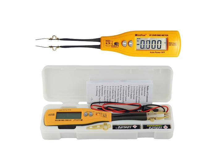 HOLDPEAK 990B SMD teszter multiméter 990 B 10 640 Ft / db [2 db 2%] [5 db 3%] [10 db 5%] Gyártó: HOLDPEAK Cikkszám: S003_110639 Súly: 0,11 kg Átvétel: Ez a termék boltunkban személyesen is átvehető. HOLDPEAK 990B SMD teszter multiméter 990 BSMD alkatrészek mérésére alkalmas műszer. A kis méretű alkatrészek esetében csipeszként használva egyszerűen és gyorsan megmérhető ellenállásuk, kapacitásuk, szakadt, vagy zárlatos állapotuk. A felületszerelt alkatrészekkel dolgozók számára szinte nélkülözhetetlen a használata.- digitális SMD teszter, multiméter.- Automatikus méréshatár váltás.- 4 számjegyes LCD kijelző.- Maximális értékkijelzés: 3000.- Polaritás független mérés (fordított polaritás esetén - kijelzése).- Alacsony elemfeszültség kijelzés.- Automatikus és manuális kikapcsolás.- Utolsó mért adat tárolása funkció.- Ellenállás mérési tartomány/kijelzési felbontás/pontosság:- 400ohm/0.1ohm/+/-2%.- 4kohm/0.1ohm/+/-2%.- 40kohm/0.1ohm/+/-2%.- 400kohm/0.1ohm/+/-2%.- 4Mohm/0.1ohm/+/-2%.- 40Mohm/0.1ohm/+/-2.5%.- Kapacitás mérési tartomány/kijelzési felbontás/pontosság:- 4nF/1pF/+/-2.5%.- 40nF/1pF/+/-2.5%.- 400nF/1pF/+/-2.5%.- 4uF/1nF/+/-2.5%.- 40uF/1pF/+/-2.5%.- 200uF/1pF/+/-3%.- Zener és LED dióda teszt.- Szakadásvizsgálat, hangjelzéssel.- Műanyag, doboz a műszer és tartozékai számára.- Mérőzsinór.- Tartalék mérőcsipesz vég.- Tápfeszültség: 3VDC 2 db AAA elemről.- Működési hőmérséklet: 0°C-40°C.- Működési páratartalom: maximum 80%.- Méretei: 207 mm x 36 mm x 26 mm.- Tömega: 110g (elemmel).- CE minősítés. Mennyiség db Kosárba tesz