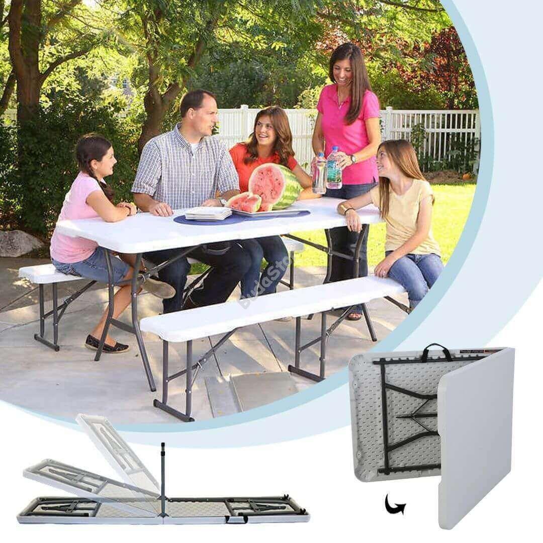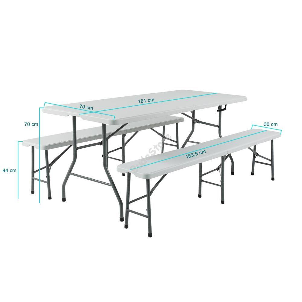 A szett 1 db asztalt és 2 db padot tartalmaz, melyeket pár egyszerű mozdulattal felállíthatod, majd össze is csukhatod.