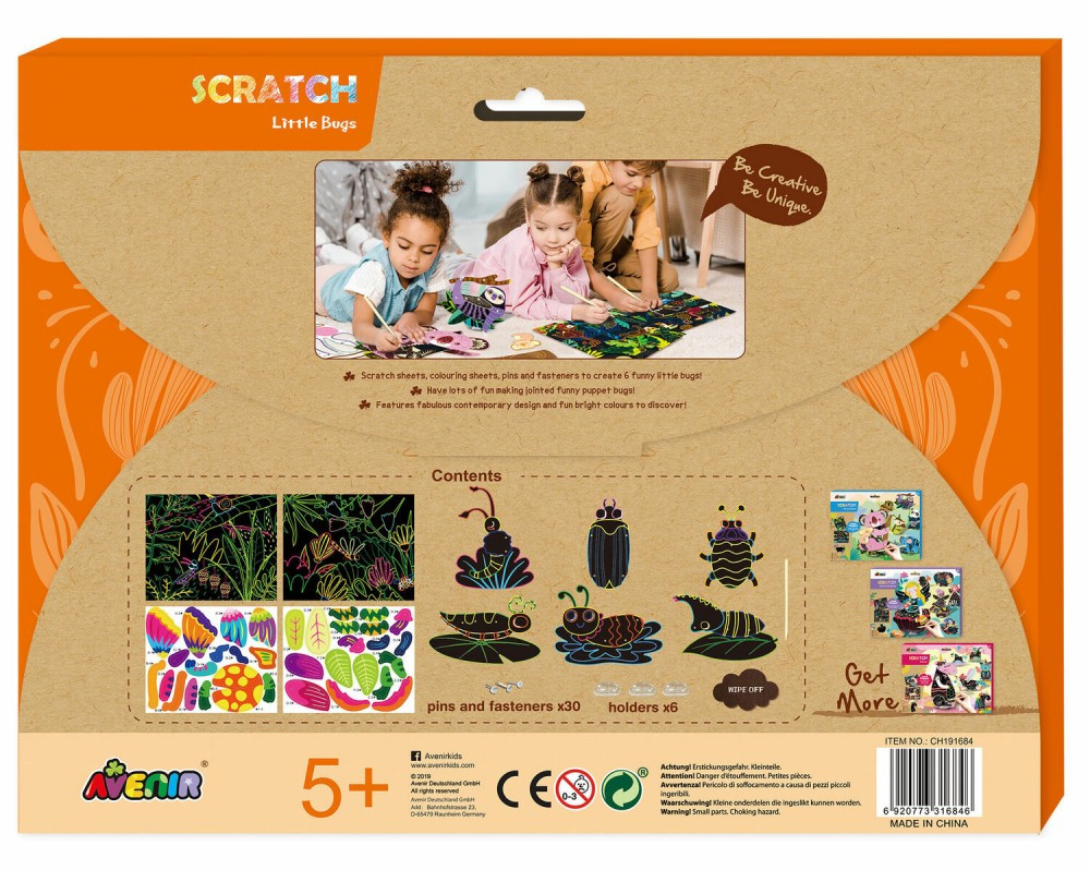 Jancsiszöges képkarcoló Bogarak Avenir AvenirCH191684 3 012 Ft / db [2 db 2%] [5 db 3%] [10 db 5%] Gyártó: AVENIR KIDS Cikkszám: S140_AvenirCH191684 Vonalkód (EAN13): 6920773316846 Súly: 0,29 kg Karckép technikával kibővített mozgatható figurák készítése az Avenir-től!Először a karckép technikával színezd ki az elemeket, majd a jancsiszögek segítségével illeszd össze a megfelelő darabokat, így életre kelnek a bogarak!A készlet segítségével 6 féle bogarat és plusz 2 képet készíthetsz el. Jellemzők Korcsoport: 5 éves kortól Kinek ajánljuk: Lányoknak és fiúknak Mennyiség db Kosárba tesz