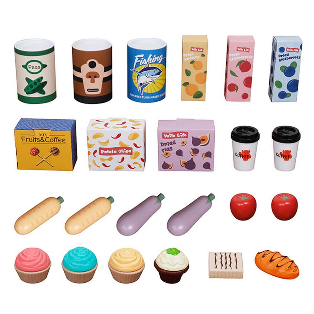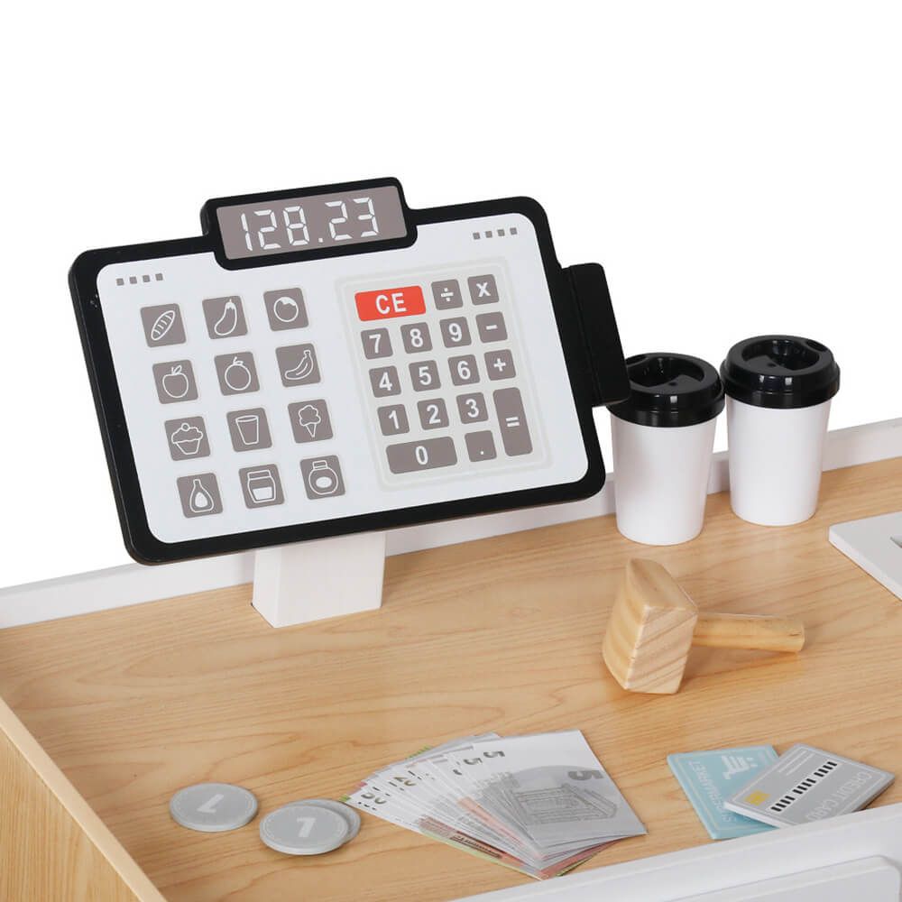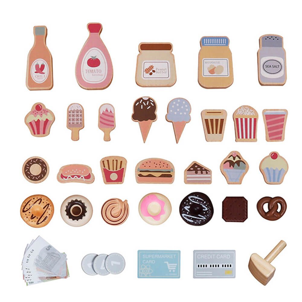A szupermarket aprólékosan kidolgozott faelemekből áll, amelyek tartósak és biztonságosak a kisgyermekek számára. A szettben megtalálható polcos állvány, pénztárgép, mérleg, játékpénz valamint különféle élelmiszer-utánzatok, mint például zöldségek, gyümölcsök, tejtermékek és pékáruk.