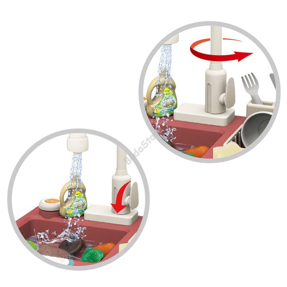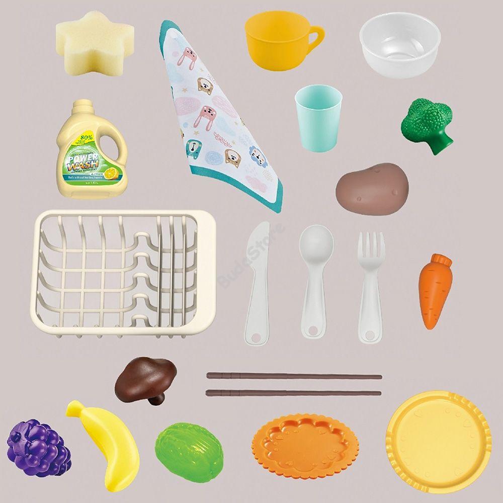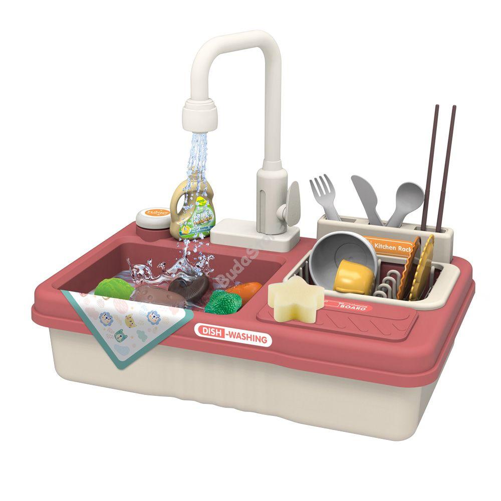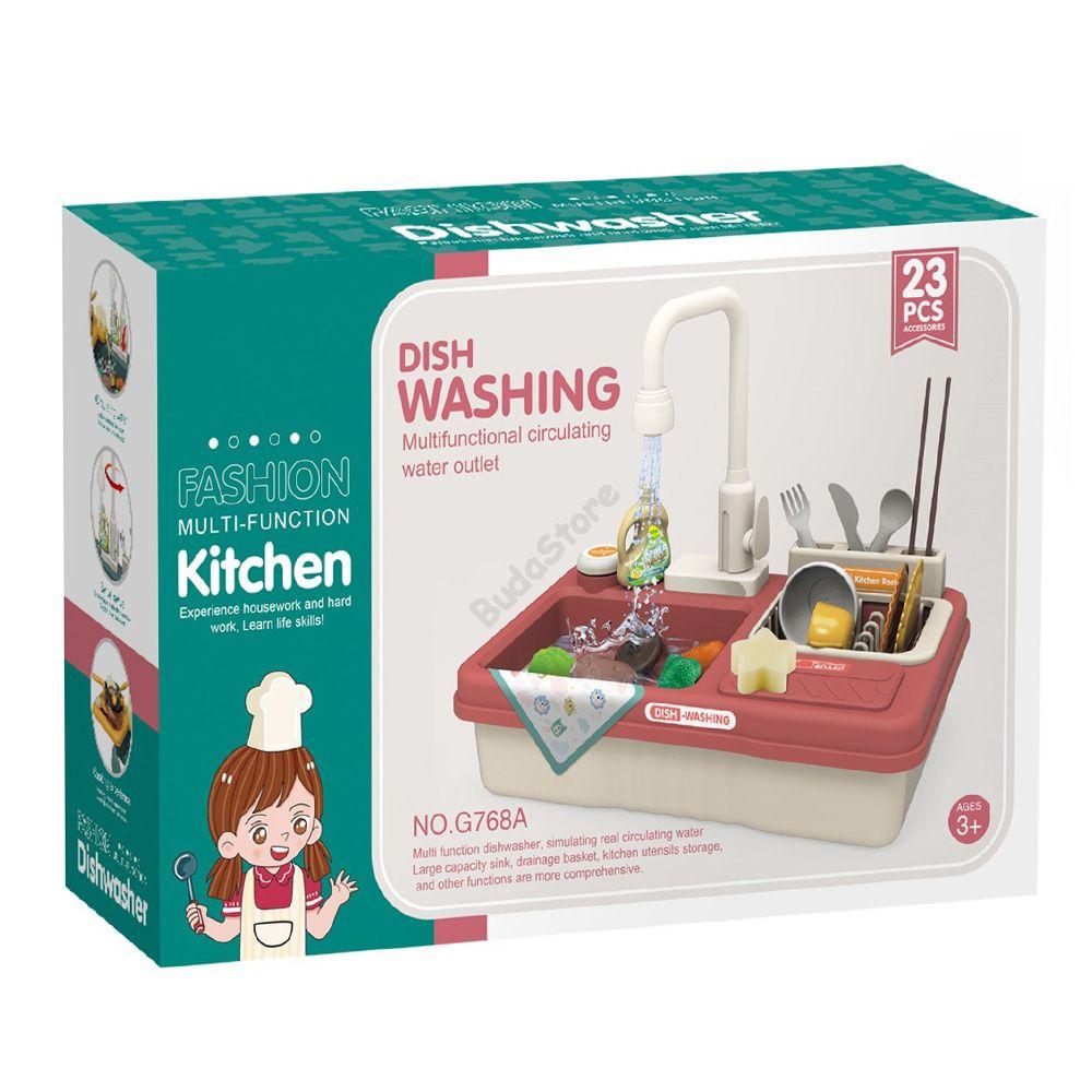 Játék közben fejlődik a kézügyesség, és az élethű tartozékoknak köszönhetően a kreativitás is szárnyra kaphat. A mosogatóból jövő vízsugár segítségével pedig könnyedén elsajátíthatják, hogyan lehet alaposan megmosni a gyümölcsöket, illetve makulátlanná varázsolni az edényeket.